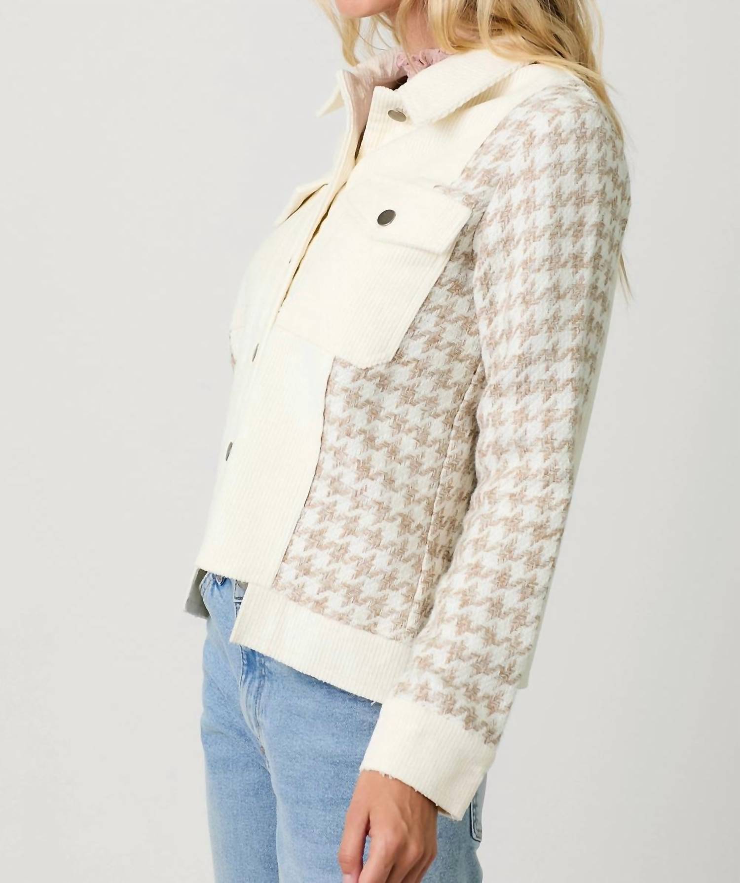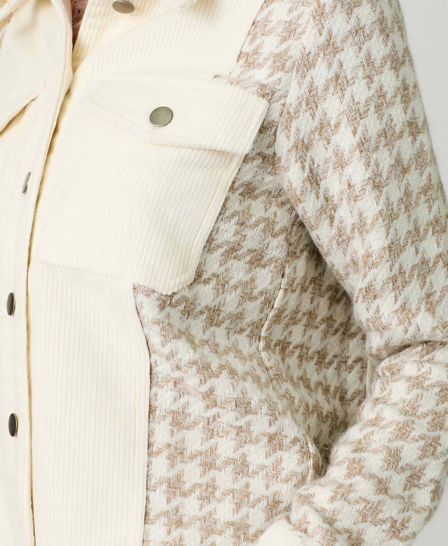 Cute, casual, and comfortable. This jacket is a must have. Elevate your fall wardrobe with the Mystree Houndstooth Corduroy Jacket, showcased in a chic ecru shade. Crafted in 100% polyester, this casual jacket features long houndstooth-patterned sleeves that blend classic style with modern design. The jacket offers a boxy fit with a collar neckline and button closure, ideal for minimalist fashion enthusiasts on vacation or during Thanksgiving. Care for this versatile piece is simple with machine wash instructions.
