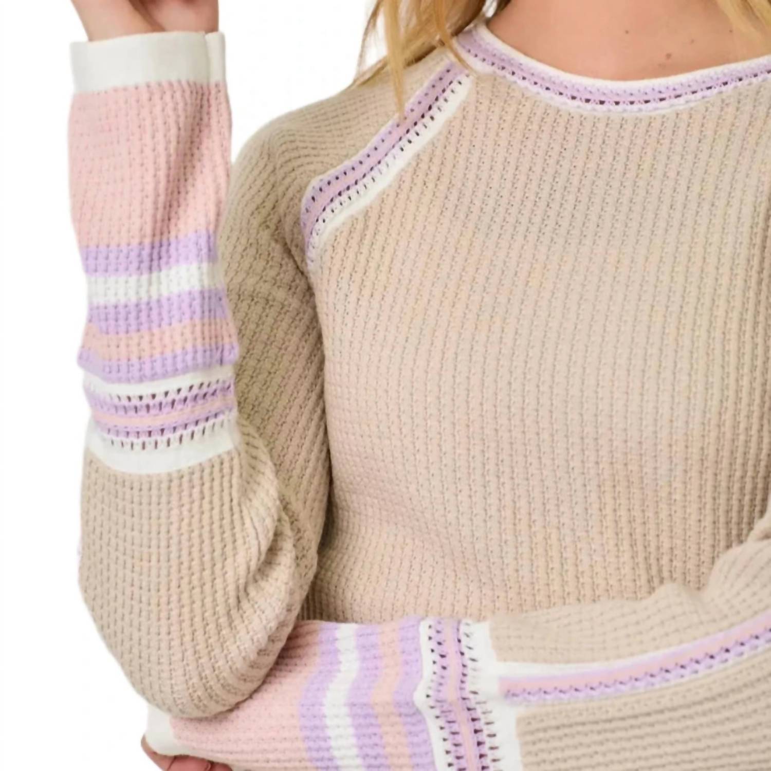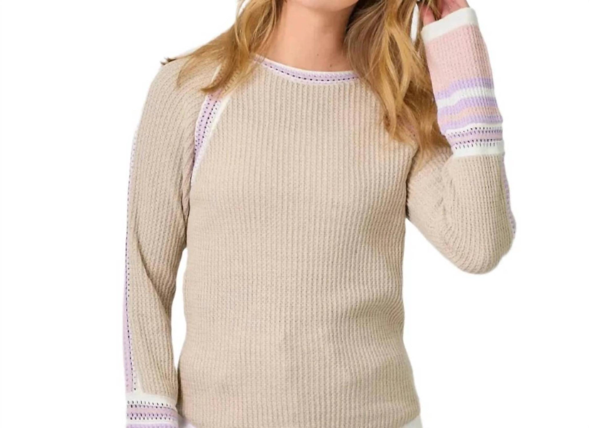 The ultimate go-to sweater, expertly crafted to provide the perfect combination of warmth and style. Its classic design and soft fabric make it a must-have addition to your wardrobe. Experience the perfect blend of comfort and style with the Mystree Raglan Sleeve Trim Detail Sweater in a chic oatmeal hue. This textured crewneck sweater features long raglan sleeves with contrasting pink, lavender, and white details at the neckline, sleeves, and cuffs. Crafted from 100% cotton, it offers a pull-on closure for easy wear. Care is simple: machine wash and lay flat to dry. Available in sizes Small, Medium, and Large, this sweater is an ideal choice for fall travel and streetwear occasions.