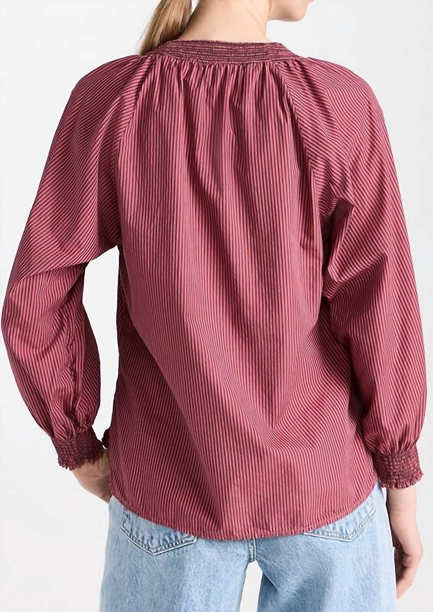 Pair this with your favorite jeans and slides for your next girls night out. Discover the Estelle Peasant Blouse by Nation LTD, a chic addition to your wardrobe in the enchanting color Burlesque. Featuring long balloon sleeves and a smocked elastic collar and cuffs, this blouse offers both style and comfort. Made from 100% pima cotton, it's crafted in imported lightweight, non-stretch weave with a striking stripe pattern. Closure: Pull on. Care: Machine wash cold. Length: 24 inches.