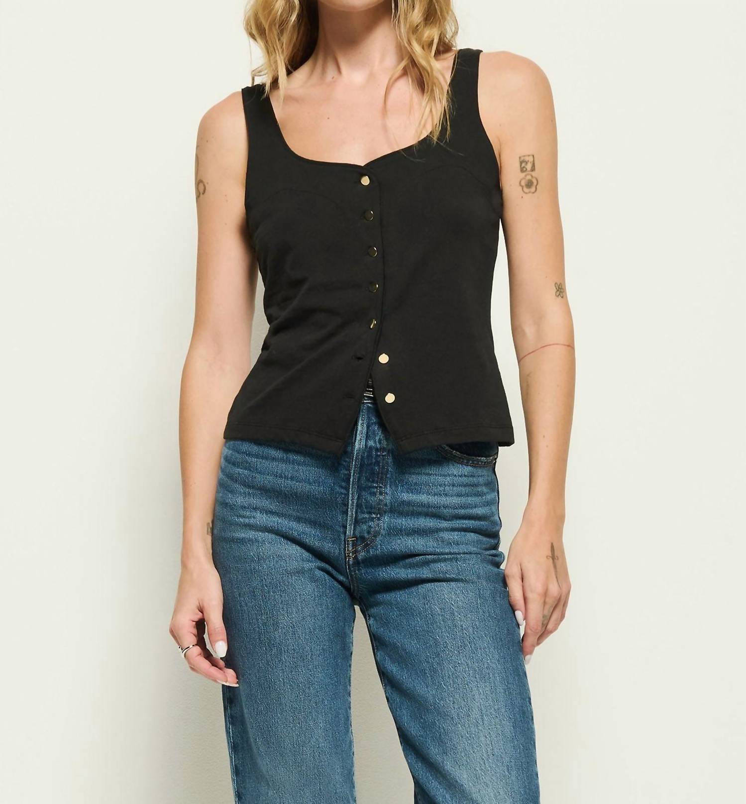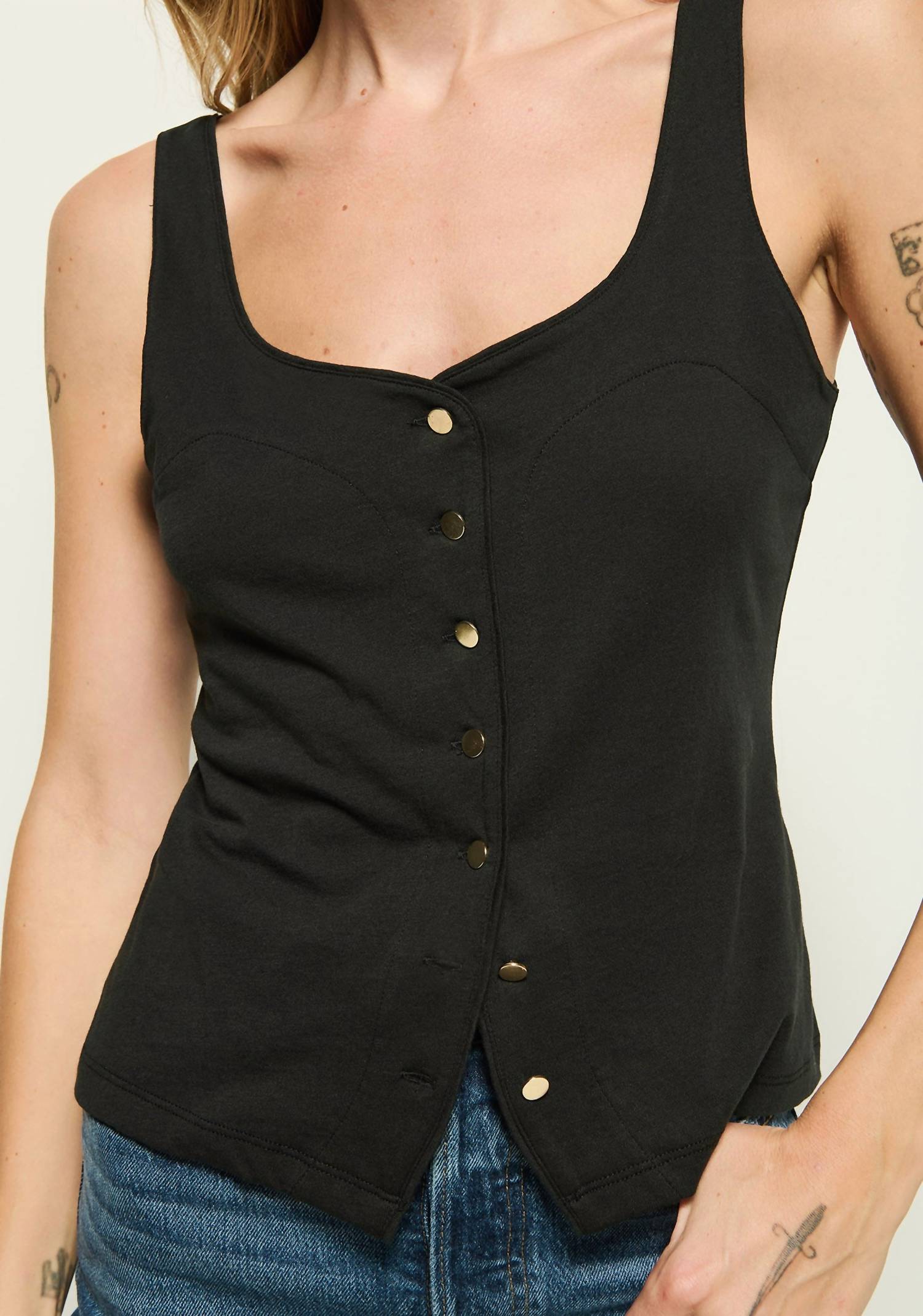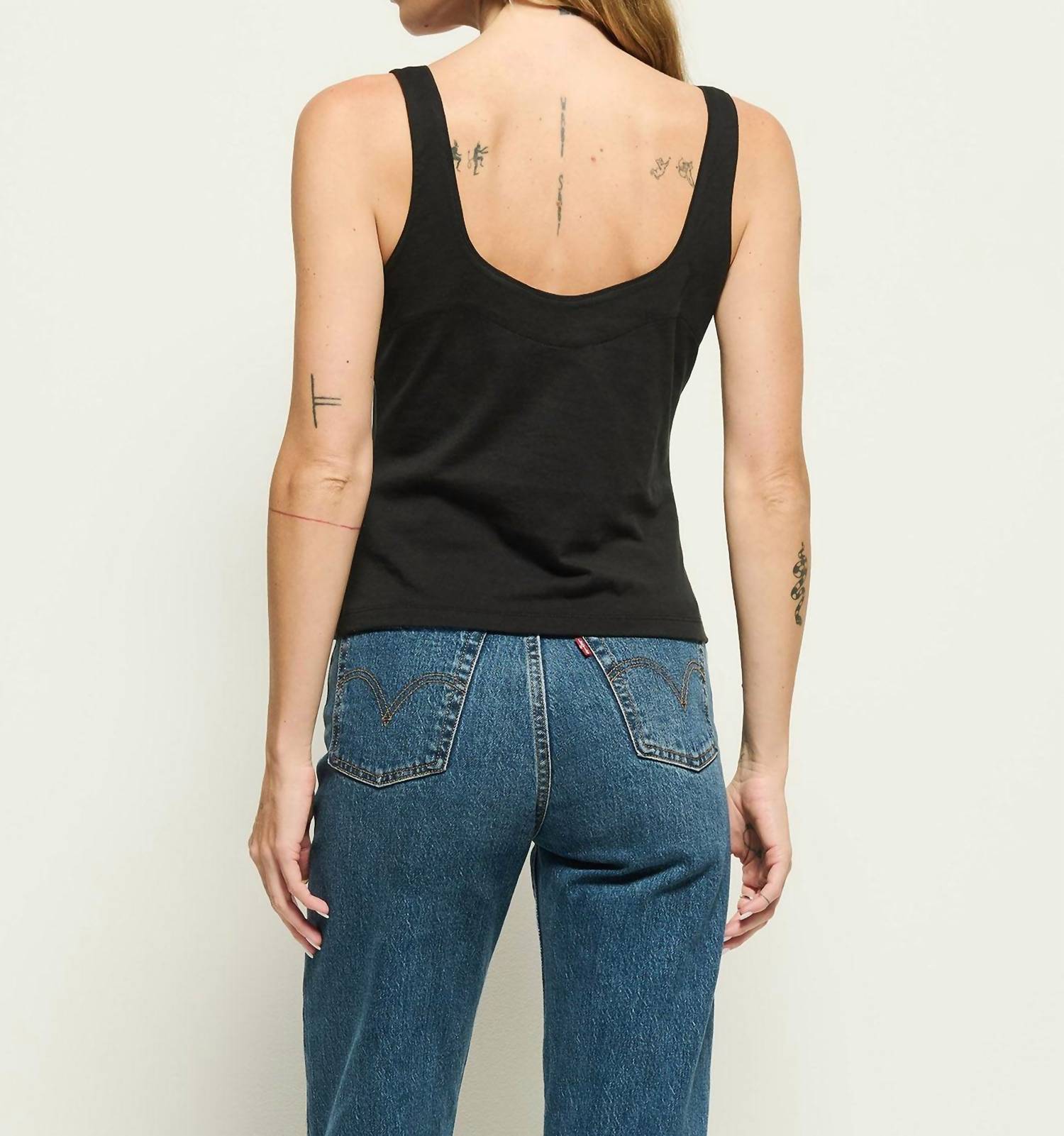 Fit, fabric and functionality. This tank top checks all the boxes. Discover the Brya Tank by Nation LTD, a preppy summer staple in sleek Jet Black. This sleeveless design is crafted from mindful organic cotton and features a luxurious, form-fitting bodice with a bra-friendly scoop neckline. Closure: Signature gold shank-button closure adds a chic touch. Care: Machine wash, lay flat to dry.