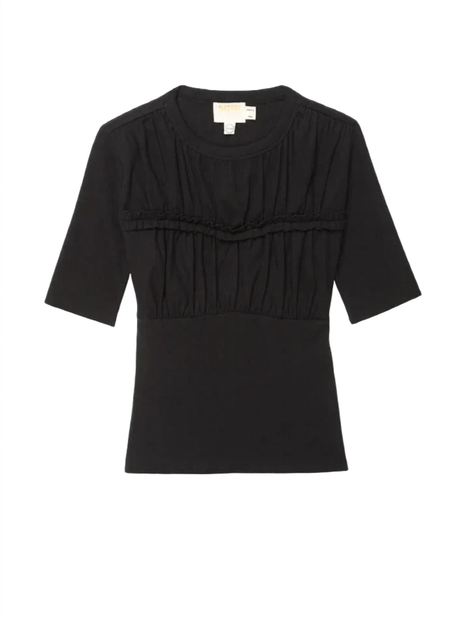 This classic, short sleeve tee will be your go-to staple this season and beyond. Discover the Lila Rouched Bust Tee by Nation LTD, a striking piece in jet black that redefines simplicity with flair. This short-sleeved top features a crew neckline and eye-catching shirring with ruffle details at the bust. Crafted from a 95% organic cotton and 5% spandex blend, it offers a form-fitting silhouette. Closure: Pull-on. Ideal for minimalist trends and perfect for a holiday party during New Year's Eve.