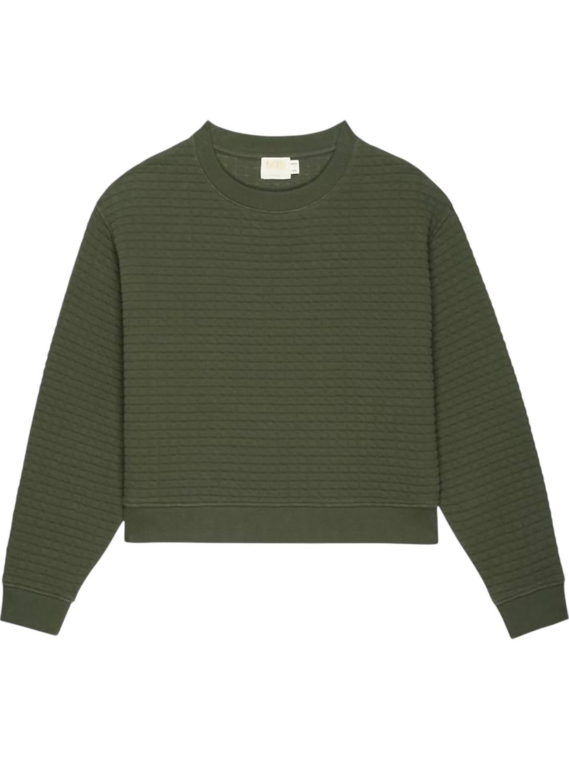 Offers a chic and cozy fit in a semi-crop design. Complements your style effortlessly. Crafted with a blend of 78% Cotton and 22% Polyester. Moss green, long-sleeve pullover. Features a textured pattern and a classic crewneck. With a pull-on closure.