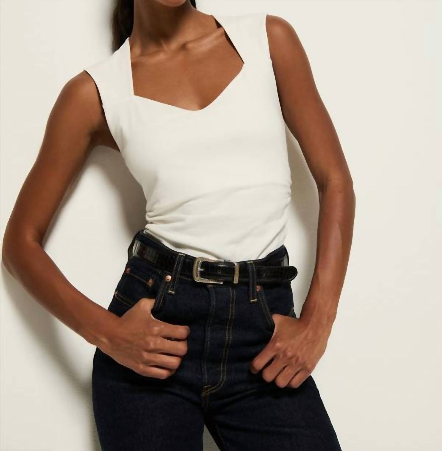 Fit, fabric and functionality. This tank top checks all the boxes. Elevate your style with the Haven Sleeveless Tee by Nation LTD, a chic addition to your wardrobe in a solid white shade. Crafted from 95% Pima Cotton and 5% Spandex, this heavyweight knit top boasts a polished sweetheart neckline and a flattering fitted silhouette. Originating from Peru, its built-in shelf liner and gathered bodice offer extra coverage and comfort. Care is effortless: simply machine wash cold, turn inside out, and lay flat to dry to maintain its softness and structure.