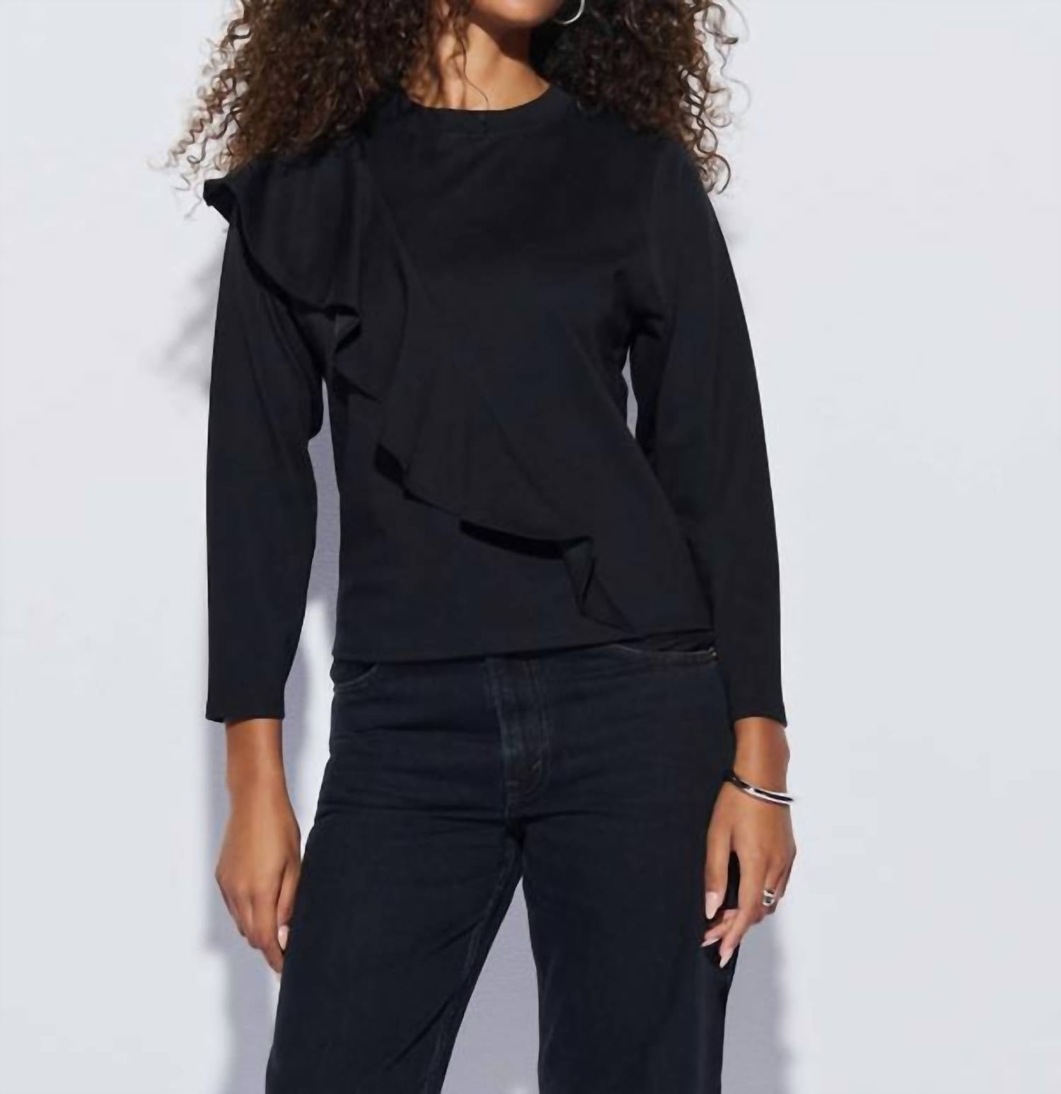 A long sleeve top you can wear with denim, skirts, well... just about anything! Experience bold elegance with the Farrah Flounce Top by Nation LTD, a standout piece in striking jet black. This long-sleeve tee showcases a daring diagonal flounce detail on both the front and back, complemented by a banded crewneck. Crafted from a comfortable cotton blend, it features 78% Cotton and 22% Tencel Lyocell for a soft feel. Designed in a pull-on style, this bra-friendly top is machine washable and can be tumble dried on low or air-dried for convenience.
