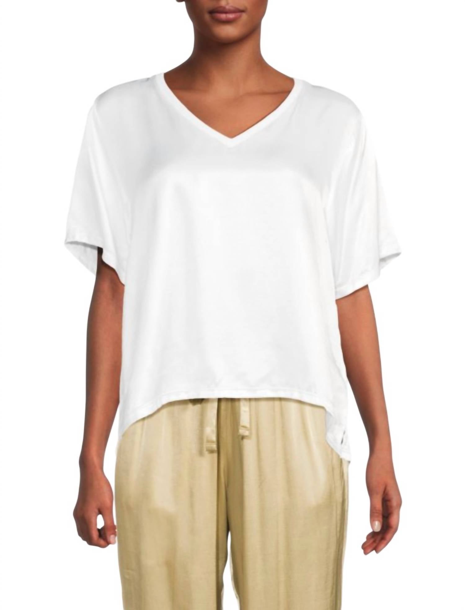 This classic, short sleeve tee will be your go-to staple this season and beyond. The Bennie Oversized Tee by Nation LTD is a chic addition to your wardrobe, offering a luxurious blend of 56% viscose and 44% rayon. This short sleeve, solid tee boasts a V-neck for a touch of minimalist elegance, perfect for spring travel or a polished New Year's Eve look. The approximately 24.5-inch length from shoulder to hem and side slits make it ideal for a stylish half tuck. With its pull-on closure, this sophisticated tee is comfortable and easy to wear. Imported and effortlessly chic, hand wash is recommended for care.