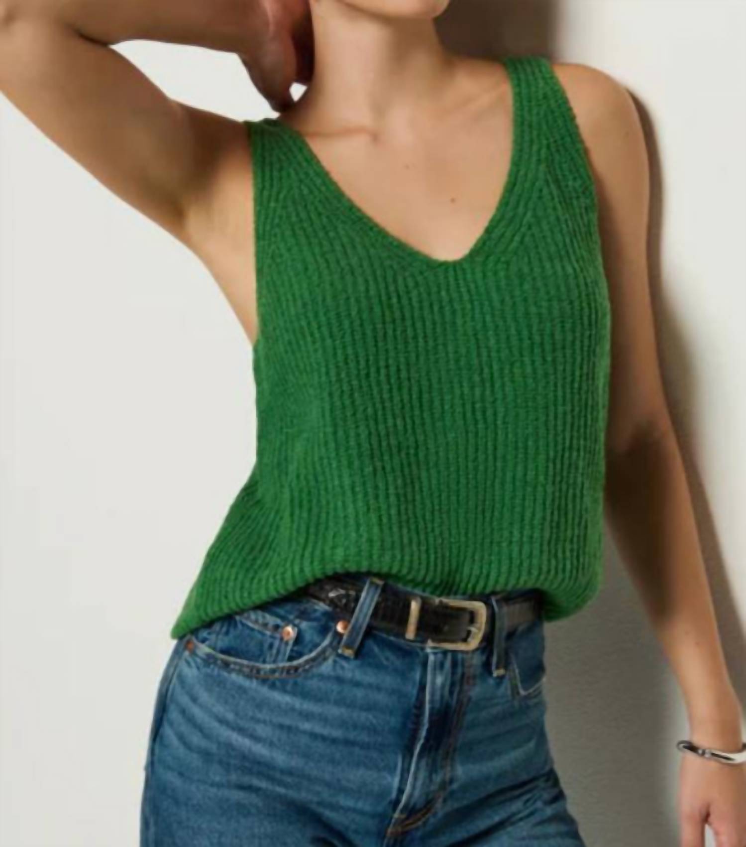 This classic tank top is perfect for layering and cute enough to wear on its own. Introducing the CeCe Sweater Tank by Nation LTD, a stylish sleeveless piece in a vibrant Green Lawn hue. Crafted from a 83.4% Pima Cotton, 16.6% Nylon, this textured tank top embodies minimalist summer chic with its elegant V-neck design. Its pull-on closure ensures ease and comfort, making it perfect for your St. Patrick's Day celebration or a summer holiday party. Care for it with machine wash and line dry to maintain its fresh look.