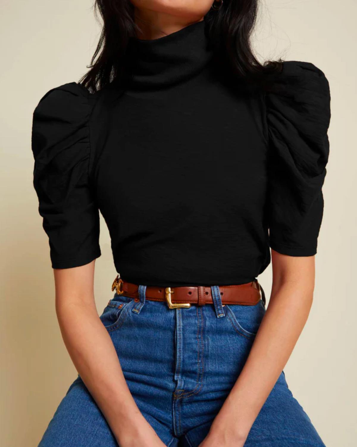 This classic, short sleeve tee will be your go-to staple this season and beyond. We can't think of an easier piece to wear than an off white, turtleneck tee with a delightfully bold shoulder (no, it’s not your mirror – those shoulders really do flatter your waistline). Tuck it into high waisted jeans and throw your hair up in a messy top knot for a look that is so effortlessly chic.