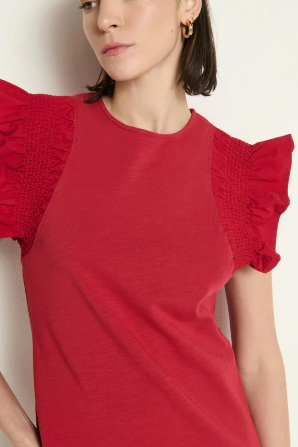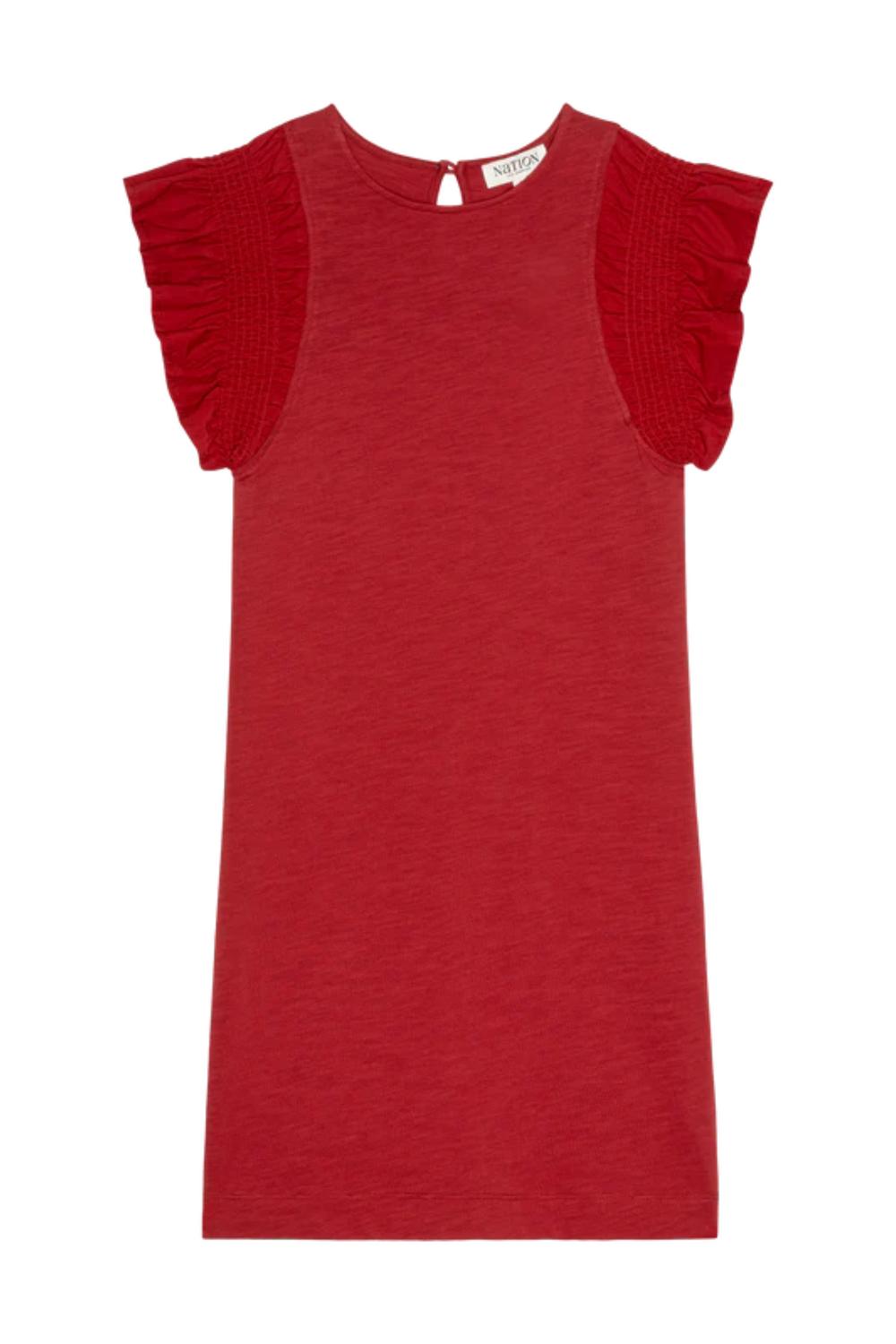 A short and breezy dress for those warmer days. Introducing the Ellis Ruffle Sleeve Dress by Nation LTD, an enticing choice in striking Rio Red, perfect for the holiday season. This women's mini dress is crafted from 100% Peruvian Cotton, ensuring a comfortable and breathable fit, and features playful cap sleeves with a smocked design. Button closure. Machine wash, line dry.