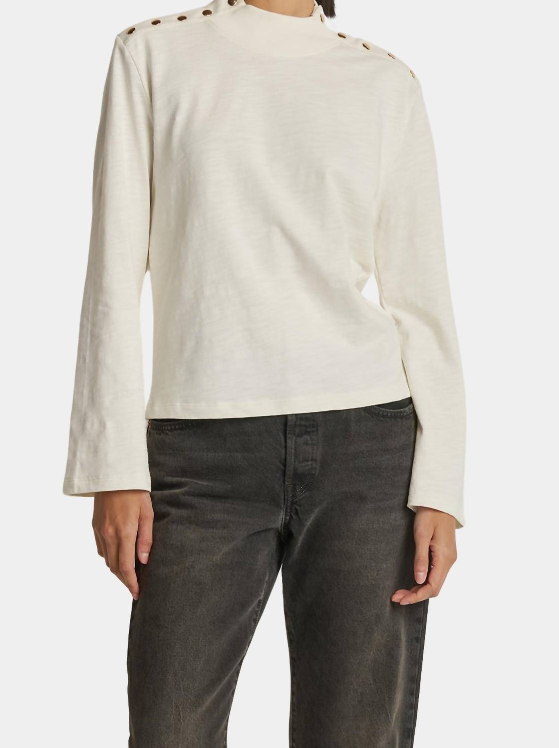 Whether you're running around town or lounging at home, this sweatshirt works for both. Elevate your winter wardrobe with the Neda Long Sleeve Top by Nation LTD, rendered in elegant Porcelain. This essential piece boasts long sleeves with soft bell accents and a structured mock neck for a sophisticated touch. 100% Cotton jersey, offering a soft yet durable feel. Pull on. Machine wash.