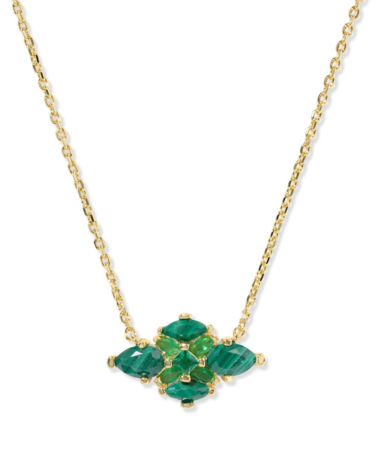 Both understated and impactful, you'll be reaching for this one-of-a-kind necklace season after season. Elevate your style with the Kendra Scott Abbie Crystal Short Pendant Necklace, showcasing a stunning goldtone with a green hue. This fine piece features a mosaic-inspired gemstone design set in the iconic Abbie shape. Material: Gold Plating. Dimensions: 19" chain with a 3" extender, featuring a 0.76"L x 0.49"W pendant.