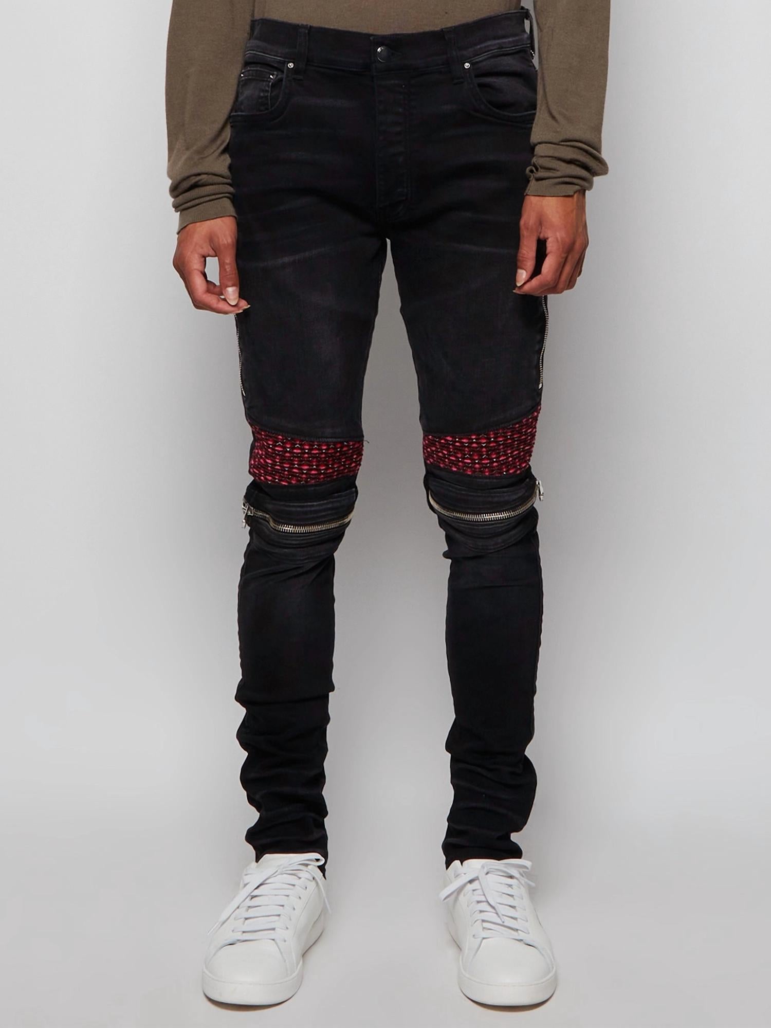 Introducing the Velvet PJ MX2 Denim Jeans by Amiri in Aged Black, perfect for adding a vibrant twist to any ensemble. These jeans feature a long length and a slim fit, with a classic five-pocket design and zipper details at the knee. Crafted from cotton, they boast a fitted silhouette with stylish pink ribbed detailing above. Closure: Button and zipper. Care: Dry clean only. Model is 6'1" and is wearing a size US34.