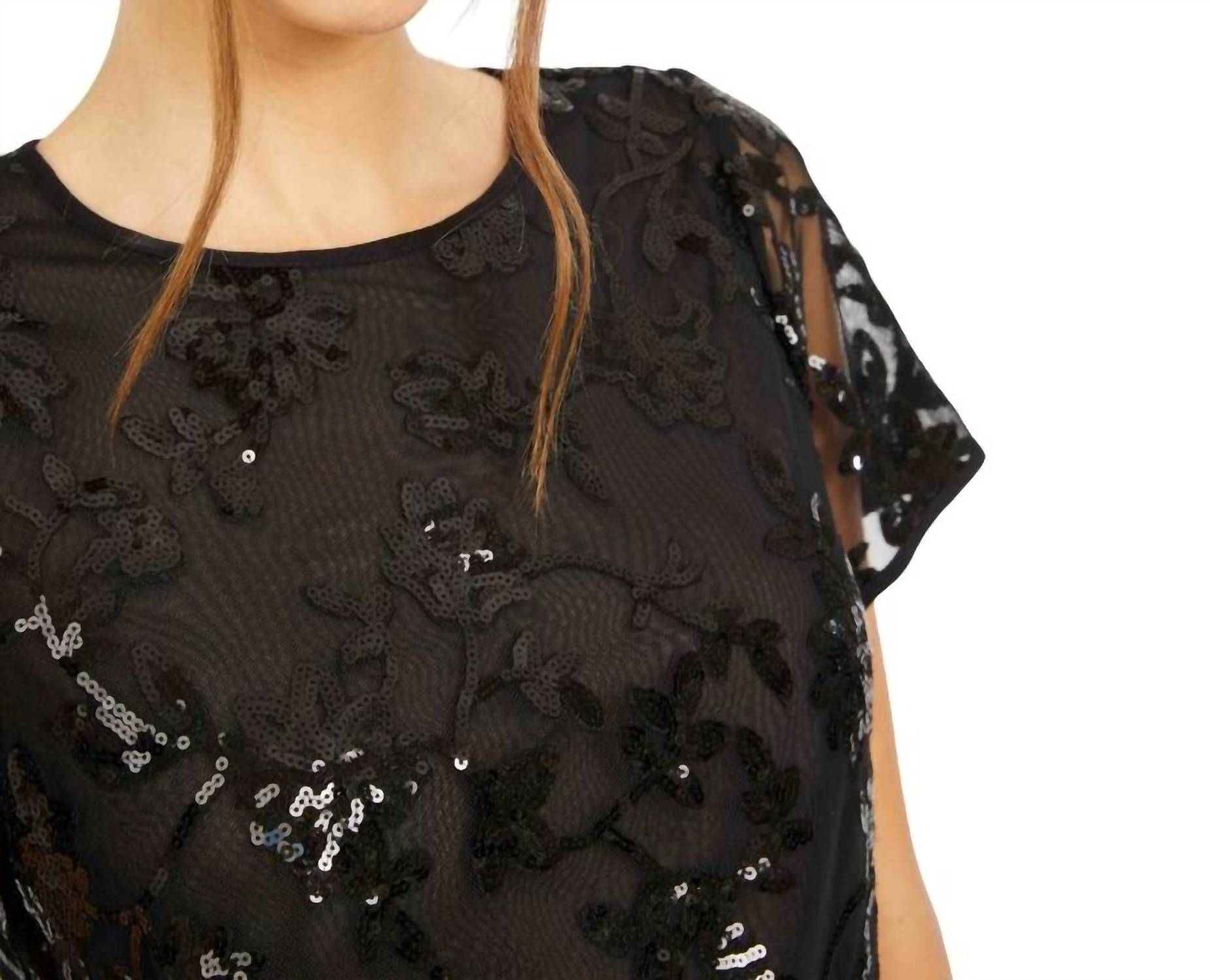 A versatile blouse that works from desk to dinner! Introduce sparkle to your spring wardrobe with the Carmen Top by CABALLERO, crafted in striking black sequin lace. This textured blouse features short sleeves and a sophisticated crewneck, perfect for a dinner party or special occasion. Its zip closure ensures a sleek fit, while its timeless design nods to Y2k trends. Care for it by dry cleaning to maintain its show-stopping appeal.