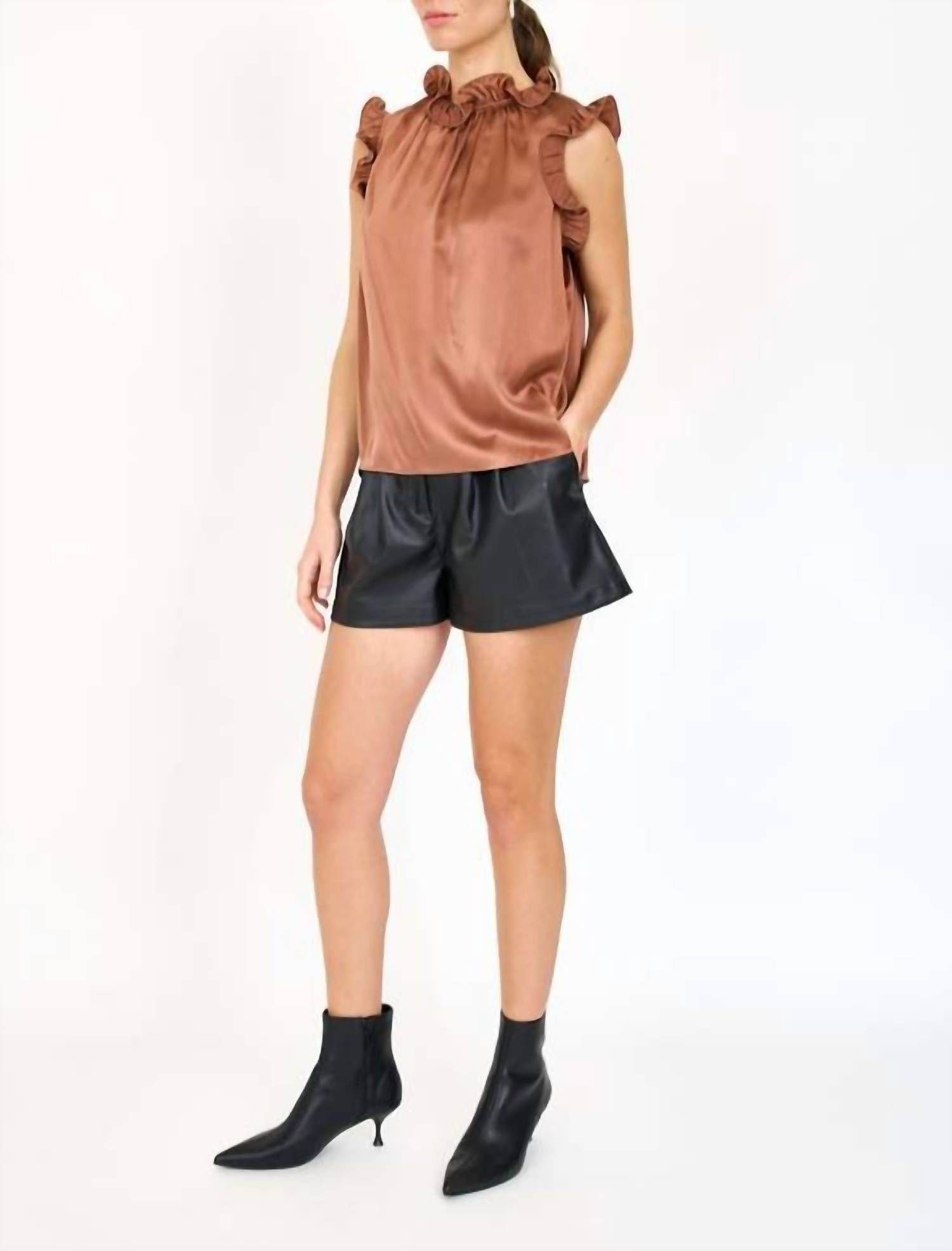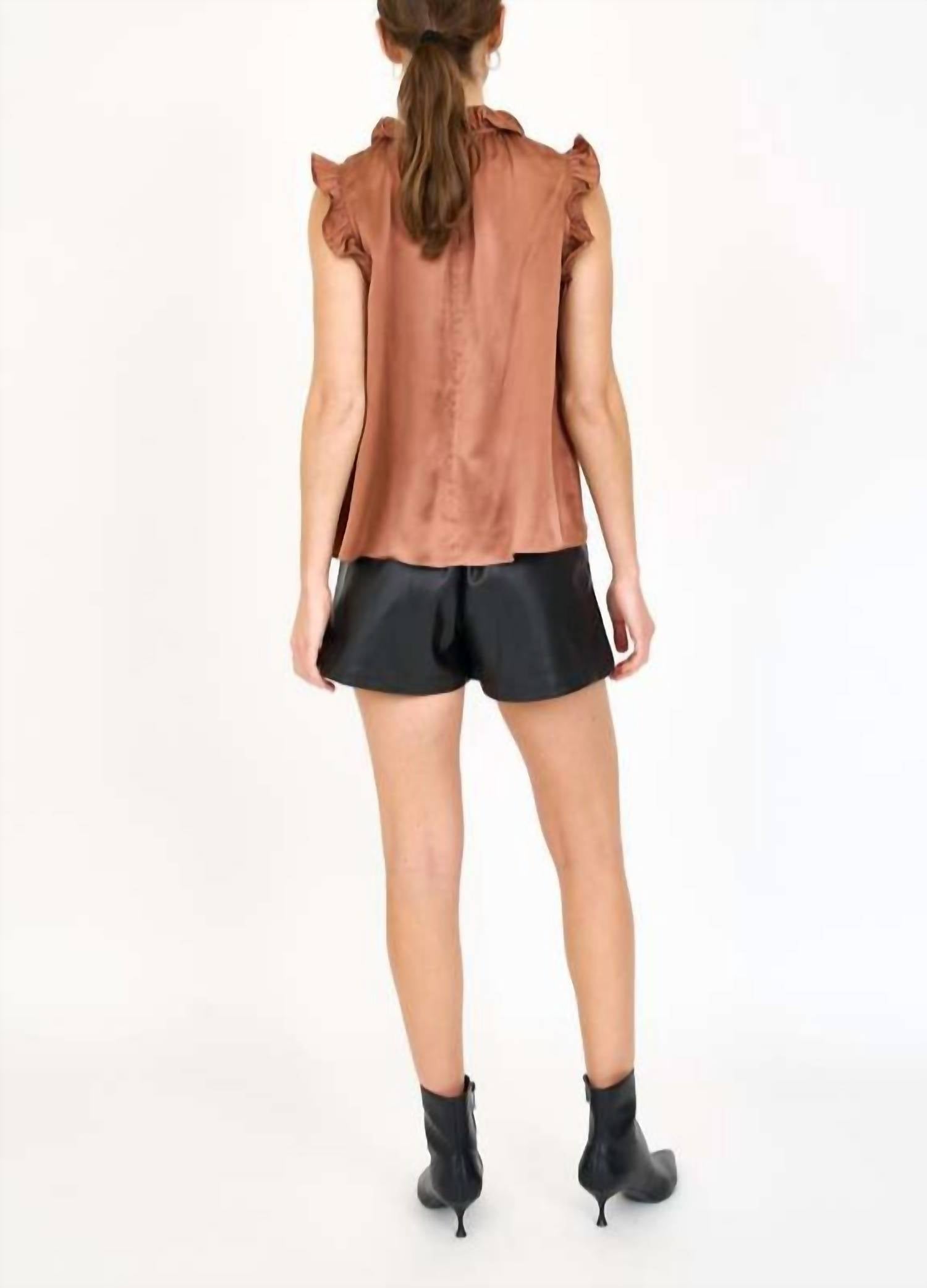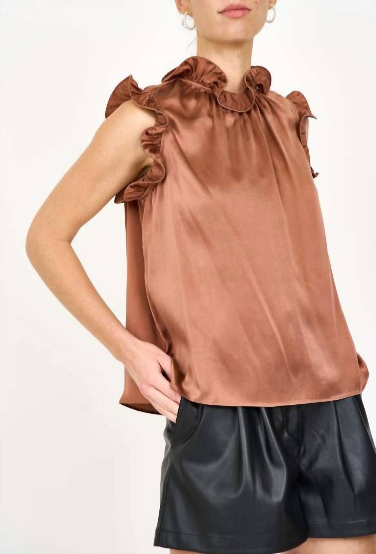 A versatile blouse that works from desk to dinner! Introducing the Renee Sleeveless Blouse by CHRISTY LYNN, an elegant addition to any wardrobe in a rustic hue. Meticulously crafted from 100% soft washed silk, this blouse features delicate ruffles embroidered at the armhole and neckline, adding a touch of sophistication. Designed with a center back keyhole and a self-covered button for a refined finish, this piece is perfect for versatile dressing. Care: Dry clean only.