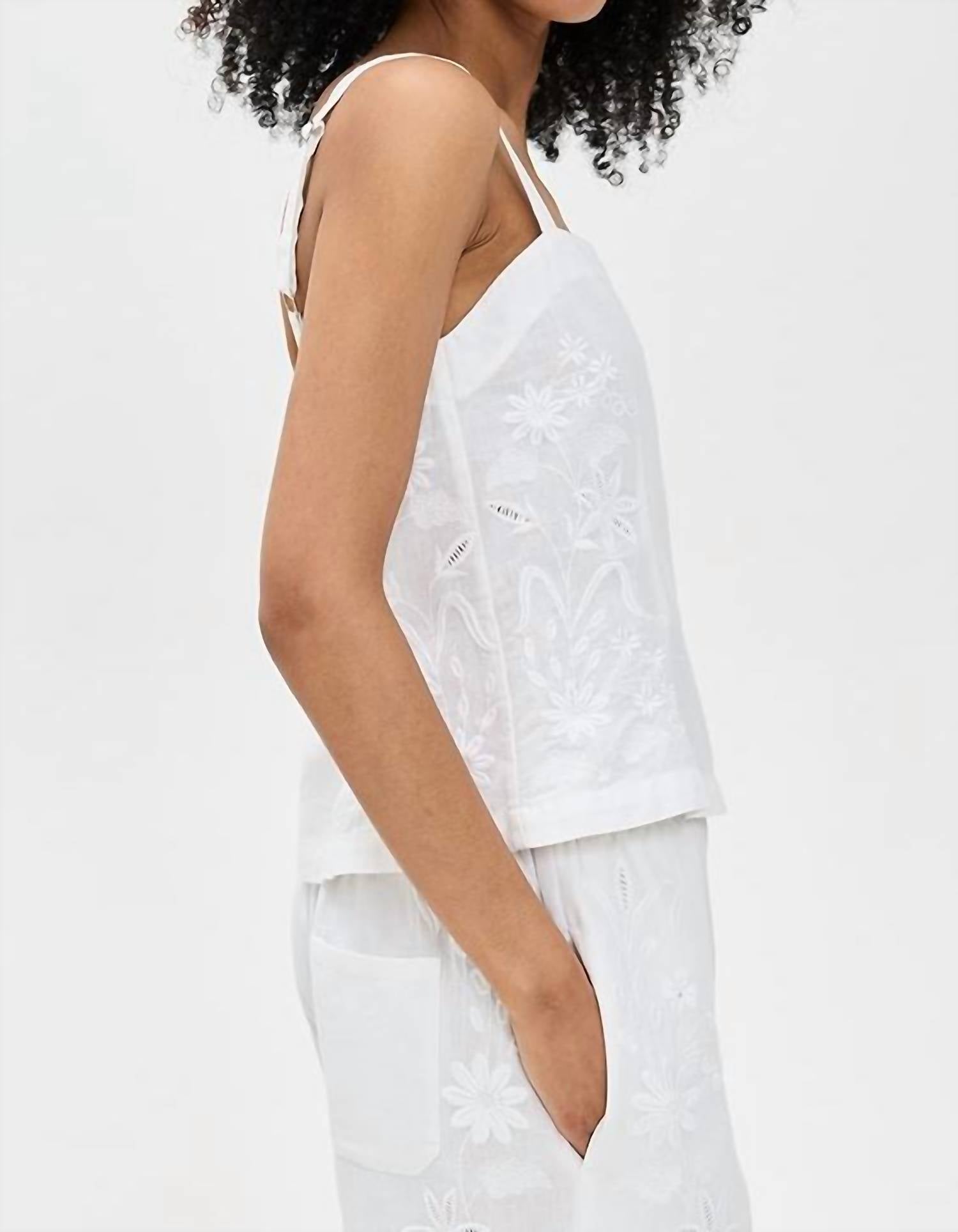 Throw this on with your favorite blazer for a more polished look. Introducing the Women's Ipanema Top by CIAO LUCIA, the perfect addition to your summer streetwear wardrobe. This sleeveless camisole in a fresh white hue features a stylish squareneck, ideal for vacation settings. With a patterned design, it offers a chic and modern take on casual wear, effortlessly appealing to those with a taste for contemporary fashion. The pull-on closure ensures ease of wear, making it a seamless choice for any outing.