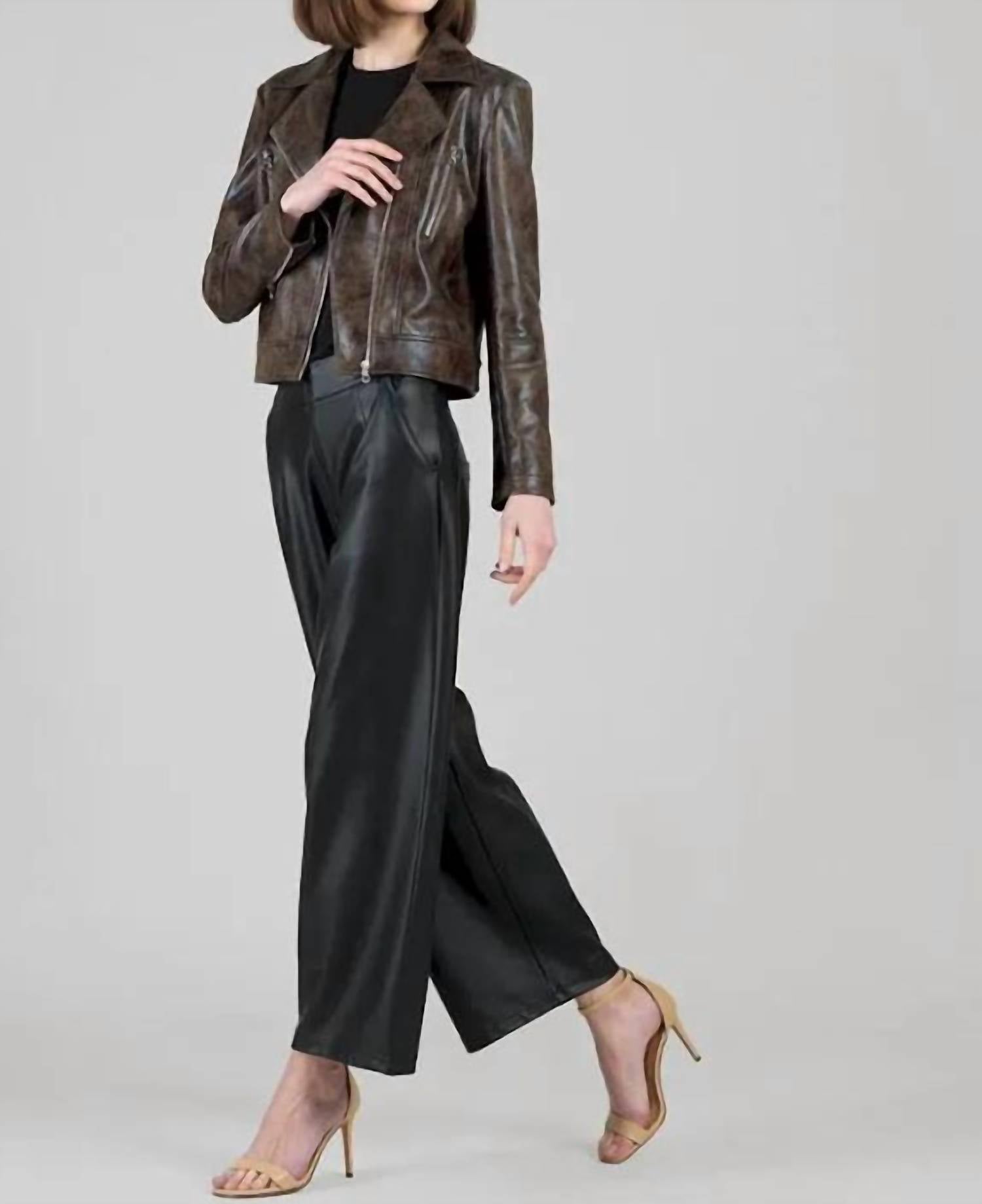 Soft leather, impeccable design. This leather jacket is a win-win. Elevate your style with the Clara Sunwoo Distressed Leather High Waist Jacket in a chic black. This women's leather jacket features long sleeves with zip details and a zip closure, crafted from 95% polyester and 5% spandex in a vegan-friendly solid pattern. Its high-waist, cropped cut, and notched lapel offer a timeless moto-inspired appeal. Care for this stylish piece by hand washing and line drying, ensuring it remains a staple for your spring dinner parties.