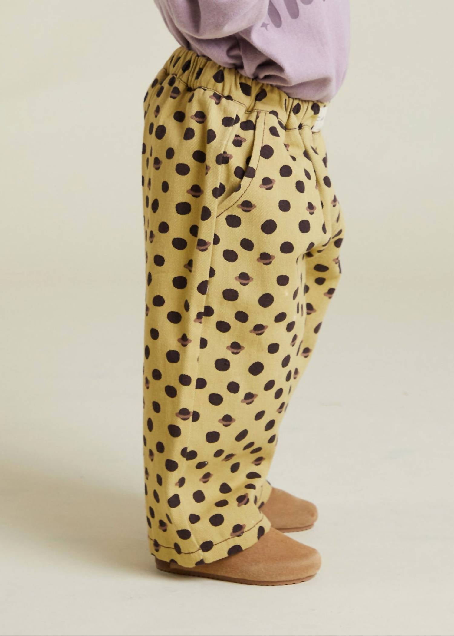 Introducing the Kids' Lowe Honey Saturn Trouser by Claude & Co, a perfect blend of comfort and style for young ones. These full-length, oversized unisex trousers feature a wide-leg and baggy fit, crafted from 100% organic cotton twill in a striking rich honey ochre color. They boast an all-over graphic Saturn pattern and come with an easy-elasticated, branded waistband ensuring relaxed wear. Ideal for a holiday party during the fall, let your little one embrace minimalist fashion effortlessly.