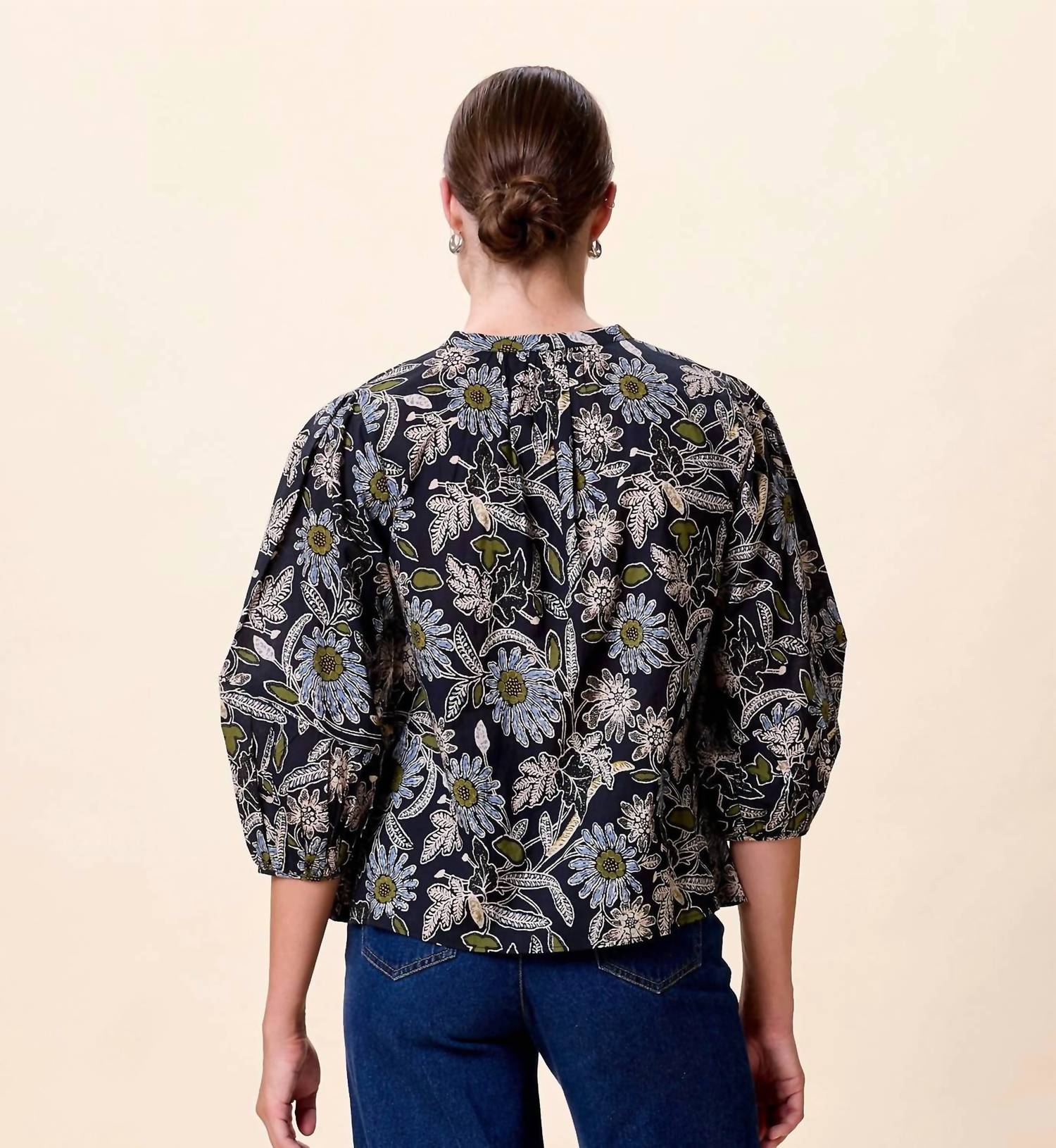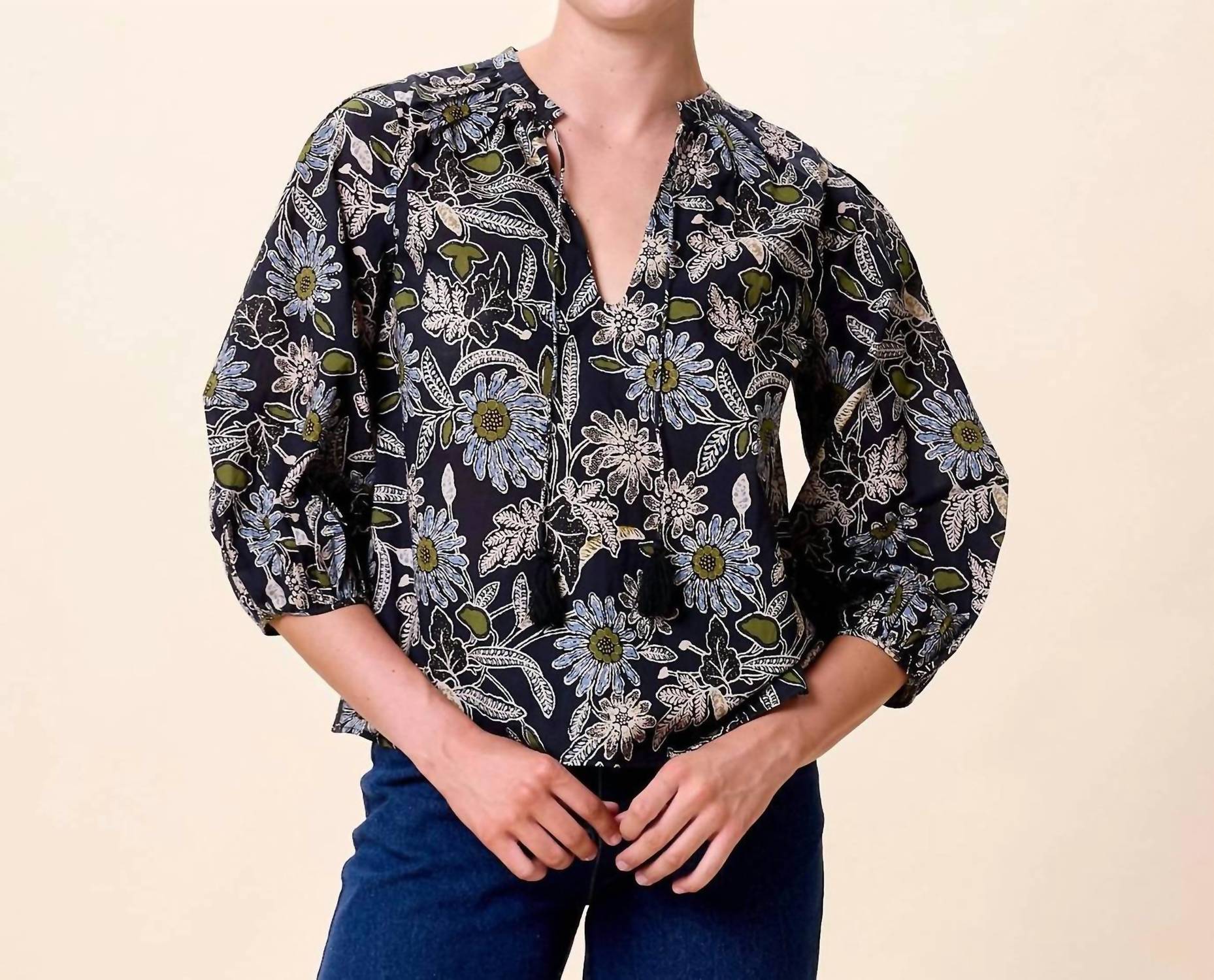 Pair this with your favorite jeans and slides for your next girls night out. Presenting the Belle Blouse by Cleobella, a quintessential boho chic staple featuring three-quarter sleeves and a stylish V-neck with a tie closure. Crafted from 100% GOTS-certified organic cotton mulmul, this blouse is ethically handmade in India, showcasing a relaxed silhouette with charming tassel details. The captivating dark Magnolia floral print adds a touch of elegance, adaptable for both daytime and evening occasions. To maintain its allure, hand wash and lay flat to dry.