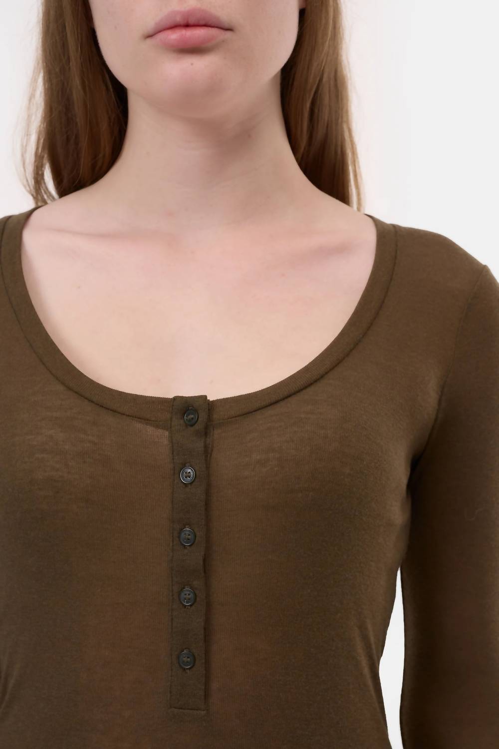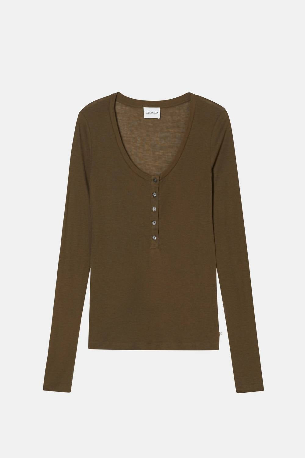 Great fit, cute design, soft fabric. You'll love everything about this long sleeve tee. Presenting the Deep Neck Long Sleeve Tee by CLOSED, a chic piece in Marsh Green perfect for any holiday party. This women's top features a long sleeve design with a wide U-neckline and a discreet Closed monogram flag label at the side seam. Expertly made in Portugal, it combines a lightweight rib jersey blend of 70% Lyocell and 30% wool for a soft feel. Enjoy a seamless pull-on closure that accentuates its slim-fit silhouette.