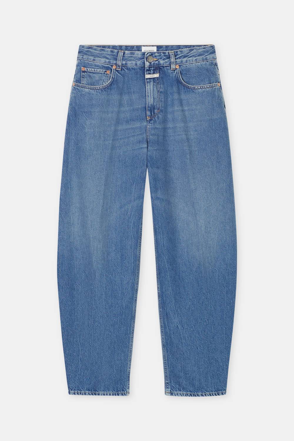 A flattering silhouette that's suprisingly versatile. Introducing the Jazzie Barrel Jeans by CLOSED, a chic staple in Mid Blue that boasts a relaxed fit with wide legs. Made from a cotton blend, these jeans feature an authentic 12 oz. denim with a unique 80's salt & pepper effect. Crafted in Italy, they include a button closure and a mid-rise waist of 11.2 inches, perfect for a stylish, laid-back look. Care: Machine wash, easy for your wardrobe rotation.