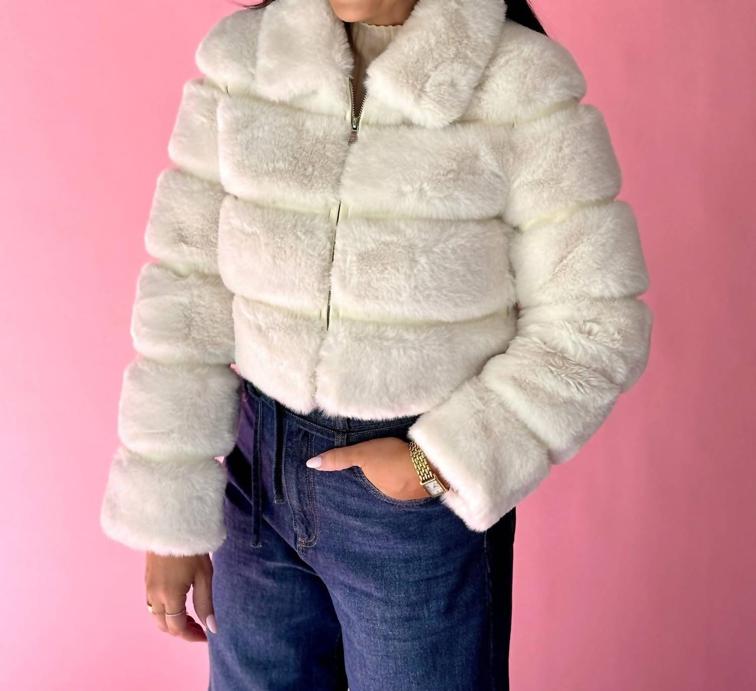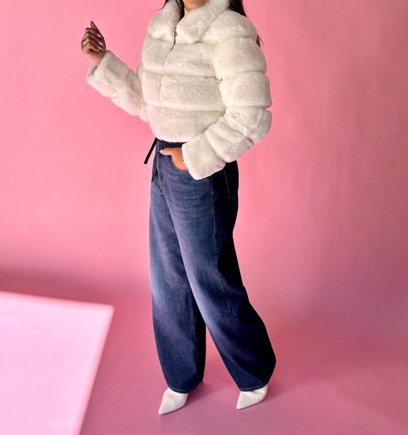 A jacket so versatile you can literally wear it with anything. Introducing the Paneled Vegan Leather Cropped Jacket by DOLCE CABO, an essential for chic vacation styling in classic ivory. This women’s jacket combines plush faux fur with sleek vegan leather in a textured, paneled design. With long sleeves and a zip closure, it features a cropped length perfect for fall’s preppy trend. Care: Dry clean only. Available true to size, but for a roomier fit, consider sizing up as Cassie opts for a medium over her usual small.