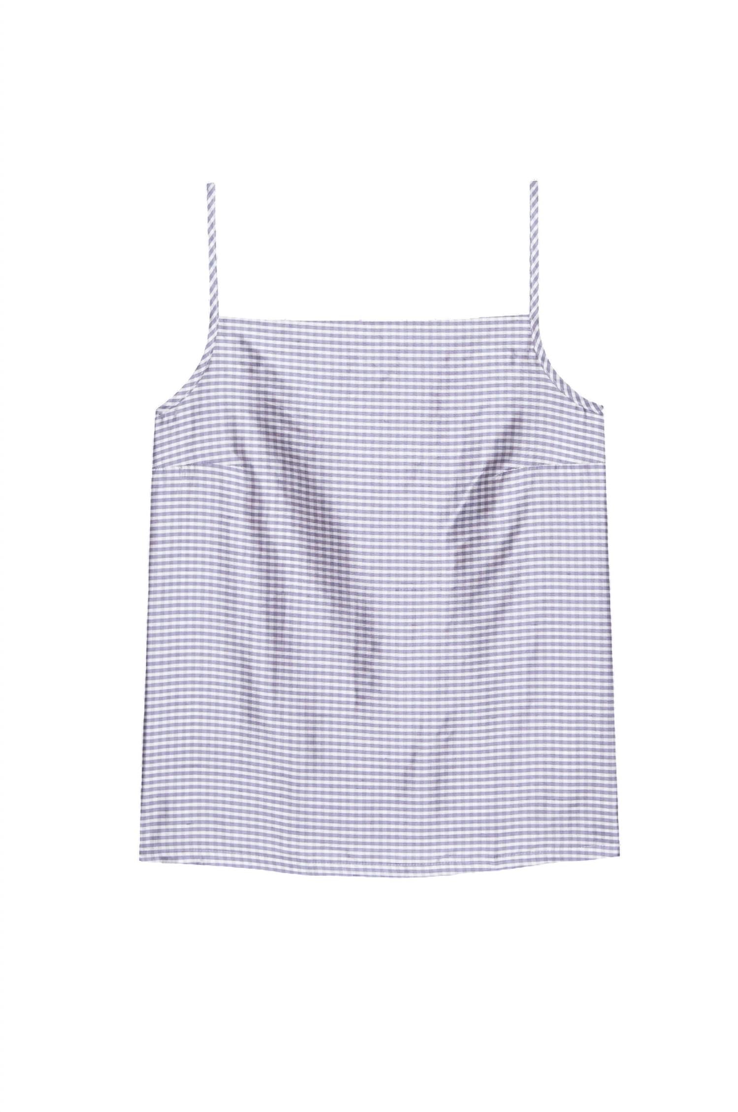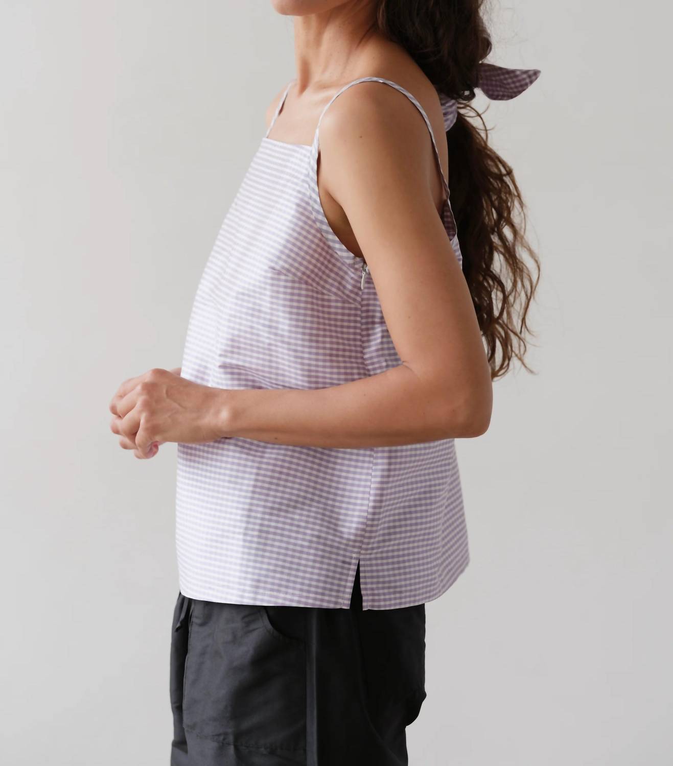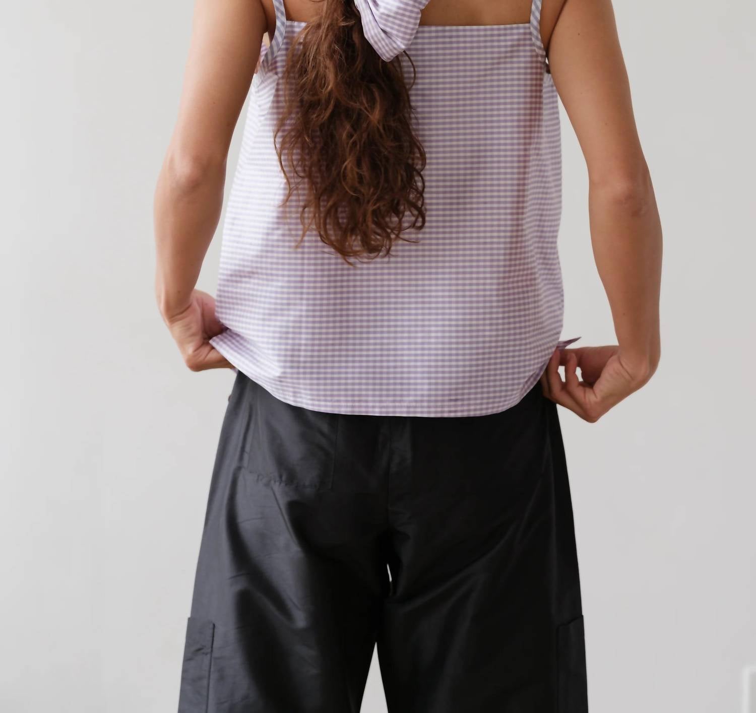 The perfect tank top for those warmer weather seasons. Introducing the Taffeta Shell Top by DONNI., a chic piece in Taro Gingham perfect for holiday parties and minimalist summer trends. This tank features delicate spaghetti straps and is expertly crafted from 100% silk taffeta, offering a crisp hand feel and subtle sheen. Designed with a squareneck and a boxy silhouette, it includes a discreet side zipper for seamless wear. Made in the Los Angeles, this elegant top is best kept pristine with dry cleaning. Model Maya is 5’9” with a 34” bust, 25” waist, and 33.5” hips, wearing a size small.