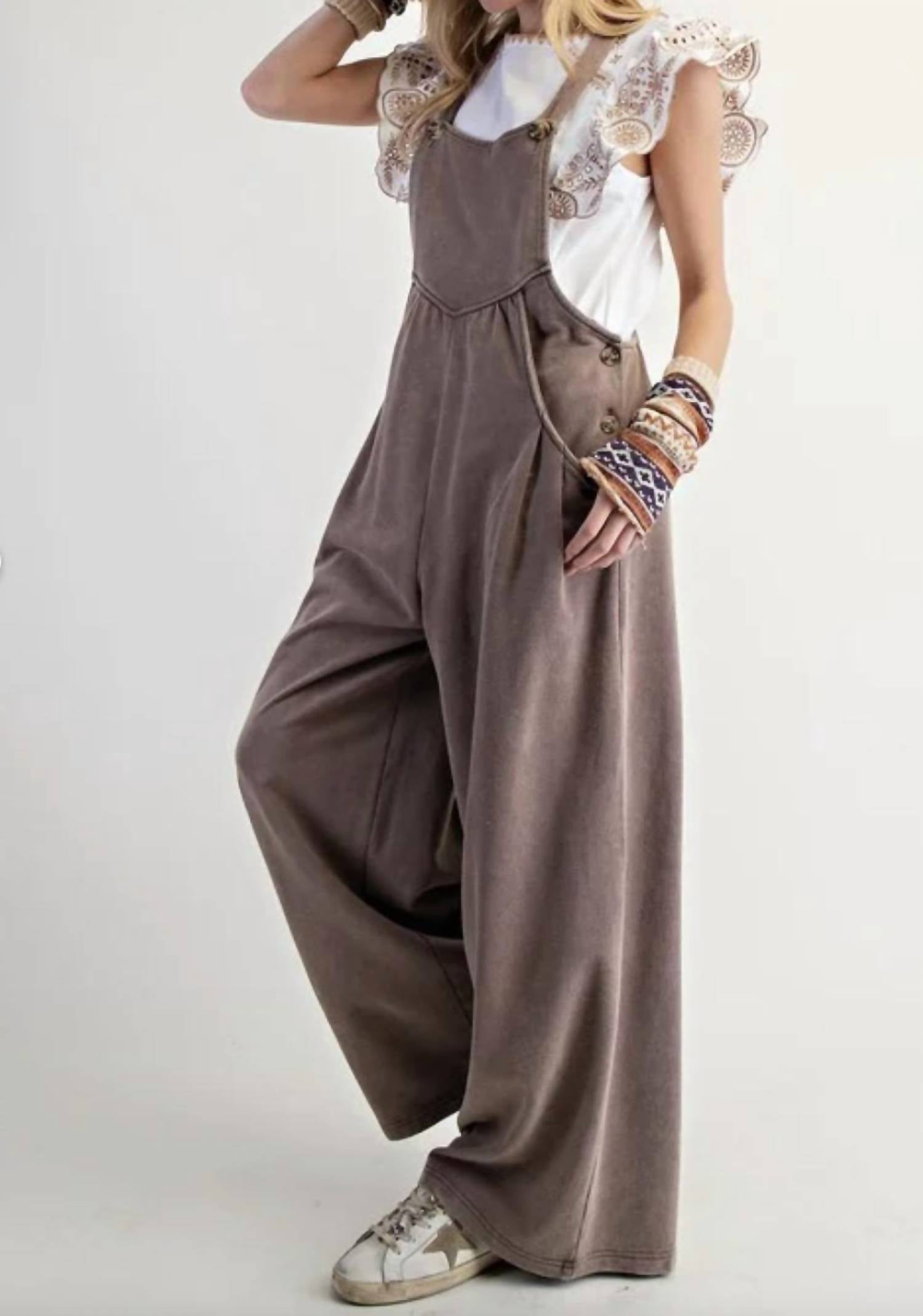 Wear these overalls any season by layering your favorite tank top or turtleneck underneath. The Washed Terry Knit Overalls by Easel offer comfort and style in a solid mocha hue. Designed with convenient pockets, these overalls feature a button closure for ease of wear. Crafted for women, they offer a laid-back aesthetic perfect for casual outings. Care instructions include machine washing them, ensuring ease of maintenance.