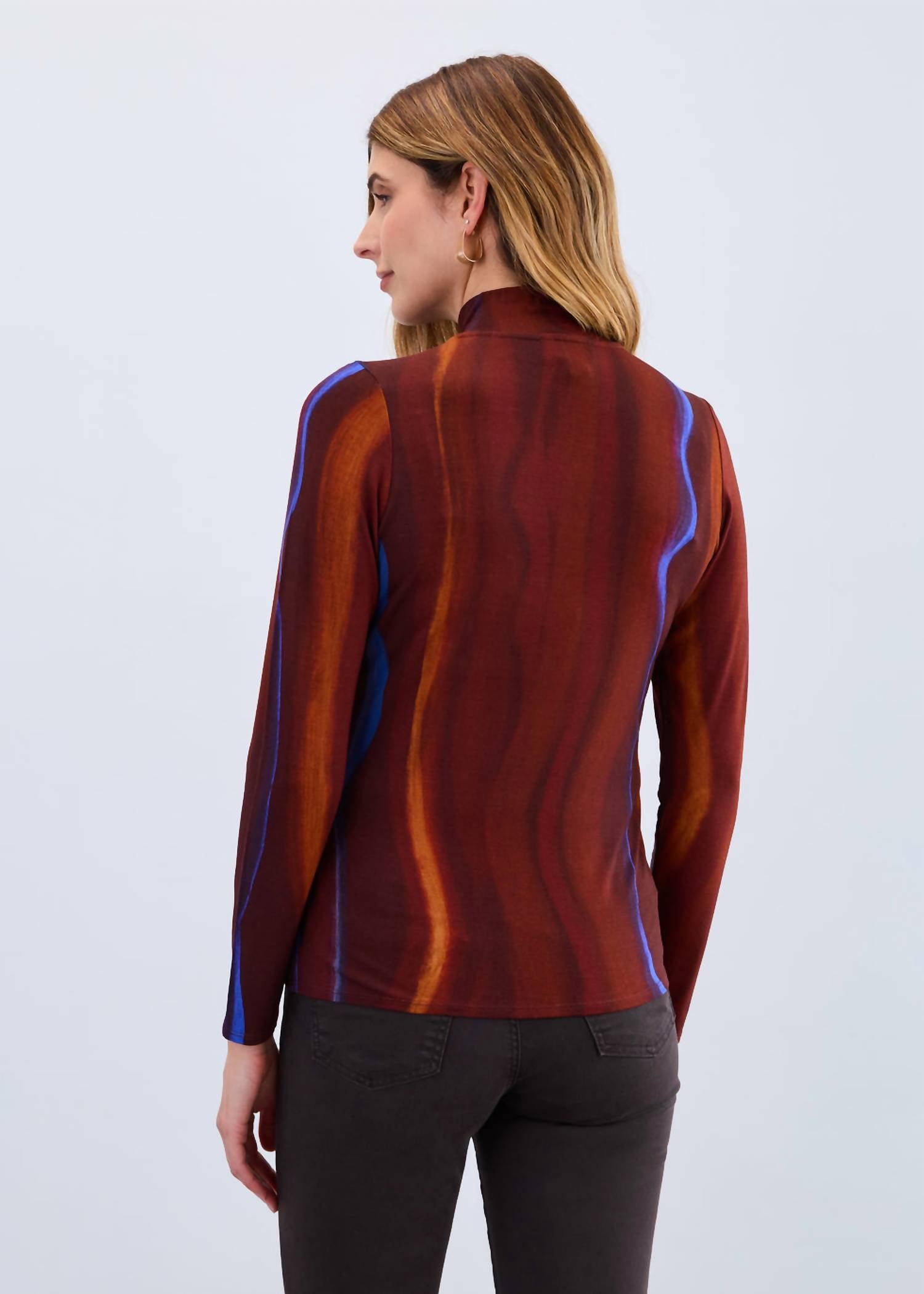 A long sleeve top you can wear with denim, skirts, well... just about anything! Elevate your vacation style with the Long Sleeve Mock Neck Top by FDJ in the standout 'Fadeout' shade. This women's top showcases a chic mock neck and is crafted from a high-quality viscose blend, comprising 95% viscose and 5% elastane. It offers a patterned design for a maximalist fall look, with a convenient pull-on closure. To maintain its pristine condition, hand wash and lay flat to dry are recommended.