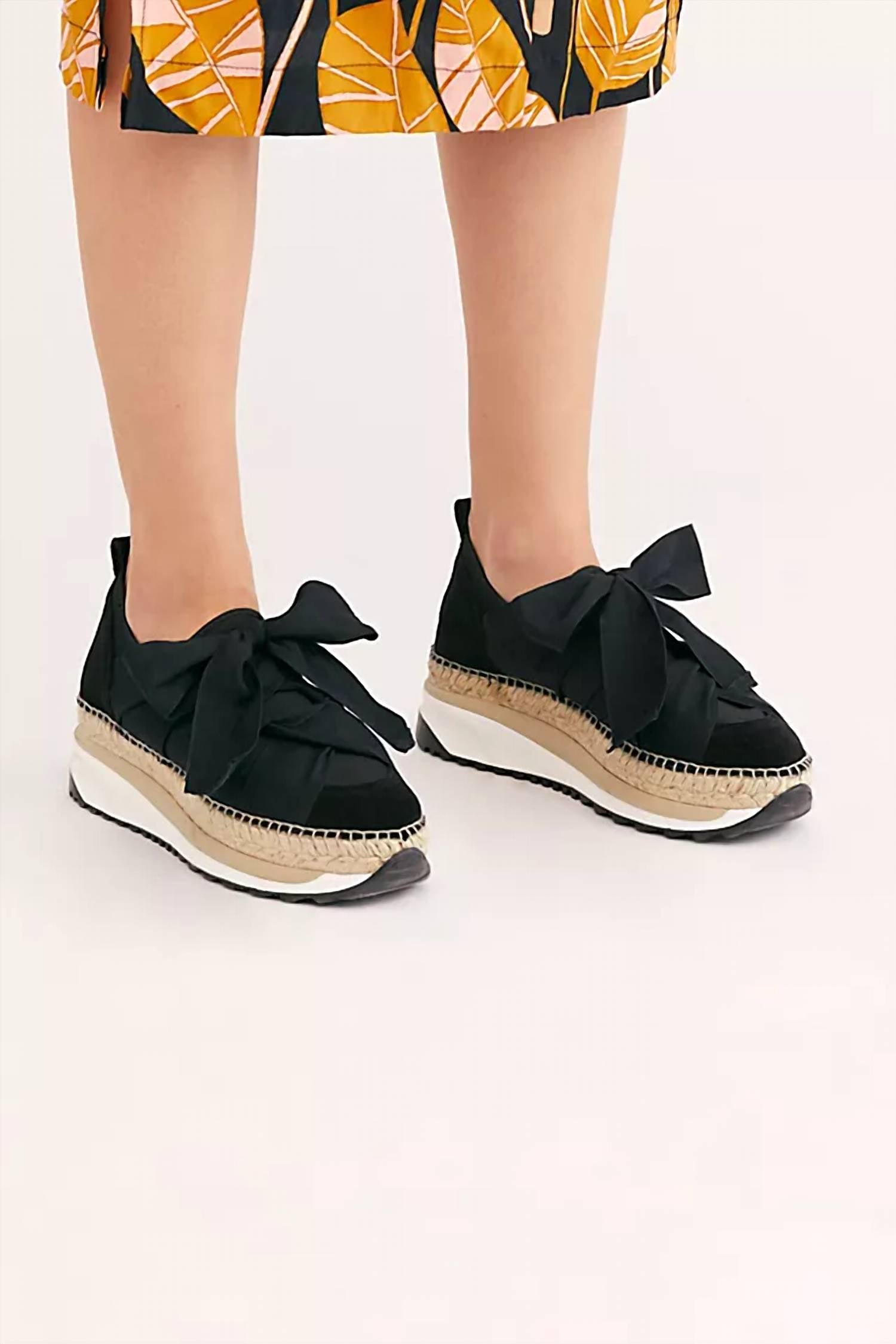 Cute, functional, and comfortable. These sneakers check all the boxes. Step into effortless style with the Women's Chapmin Espadrille Sneaker by Free People, perfect for your vacation wardrobe. Crafted with a suede upper in chic black, these sneakers feature a charming bow detail and a convenient pull tab for easy slip-on styling. Designed with a comfortable almond toe shape, these sneakers boast a 2-inch platform and covered wedge heel, complemented by a lugged rubber outsole for added traction. Composition includes a synthetic lining and an imported finish, making these sneakers a stylish and practical choice for spring and Thanksgiving get-togethers.