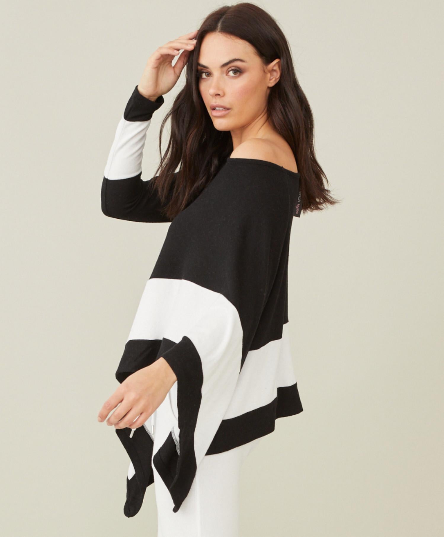 The perfect long sleeve tee that goes with just about anything. Elevate your spring wardrobe with the Asymmetrical Long Sleeve Top by French Kyss, perfect for a dinner party. Made with a blend of Viscose, Polyester, and Elastane, this black and ivory patterned top offers a chic off-the-shoulder neckline and hits at the hips. It features a pull-on closure for easy wear and is imported for quality craftsmanship. For care, opt for a delicate hand wash or dry clean.