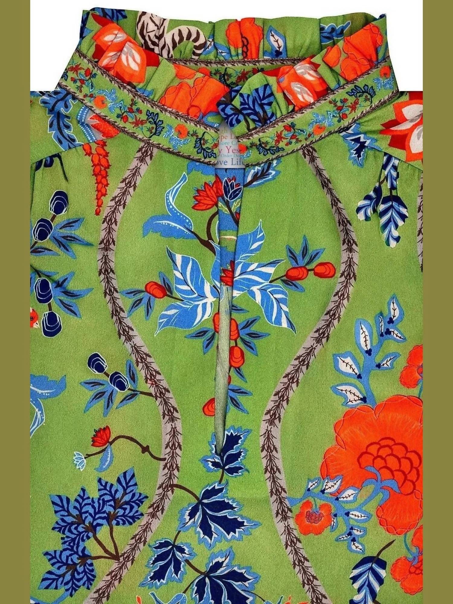 Discover the versatile charm of this tunic blouse, designed with both layering and standalone wear in mind. Its flattering silhouette and stylish details make it a closet essential. Discover the Jungle Symphony Ruffle Neck Tunic Top by GRETCHEN SCOTT, a stunning piece in an olive hue featuring a trendy boho chic pattern. Designed for spring holiday parties, this tunic offers three-quarter sleeves and an elegant mandarin ruffle slit neck for a touch of sophistication. With a pull-on closure and a flattering 25" length, it showcases 7" side slits for added flair. Crafted for easy care, simply machine wash to maintain its beauty.