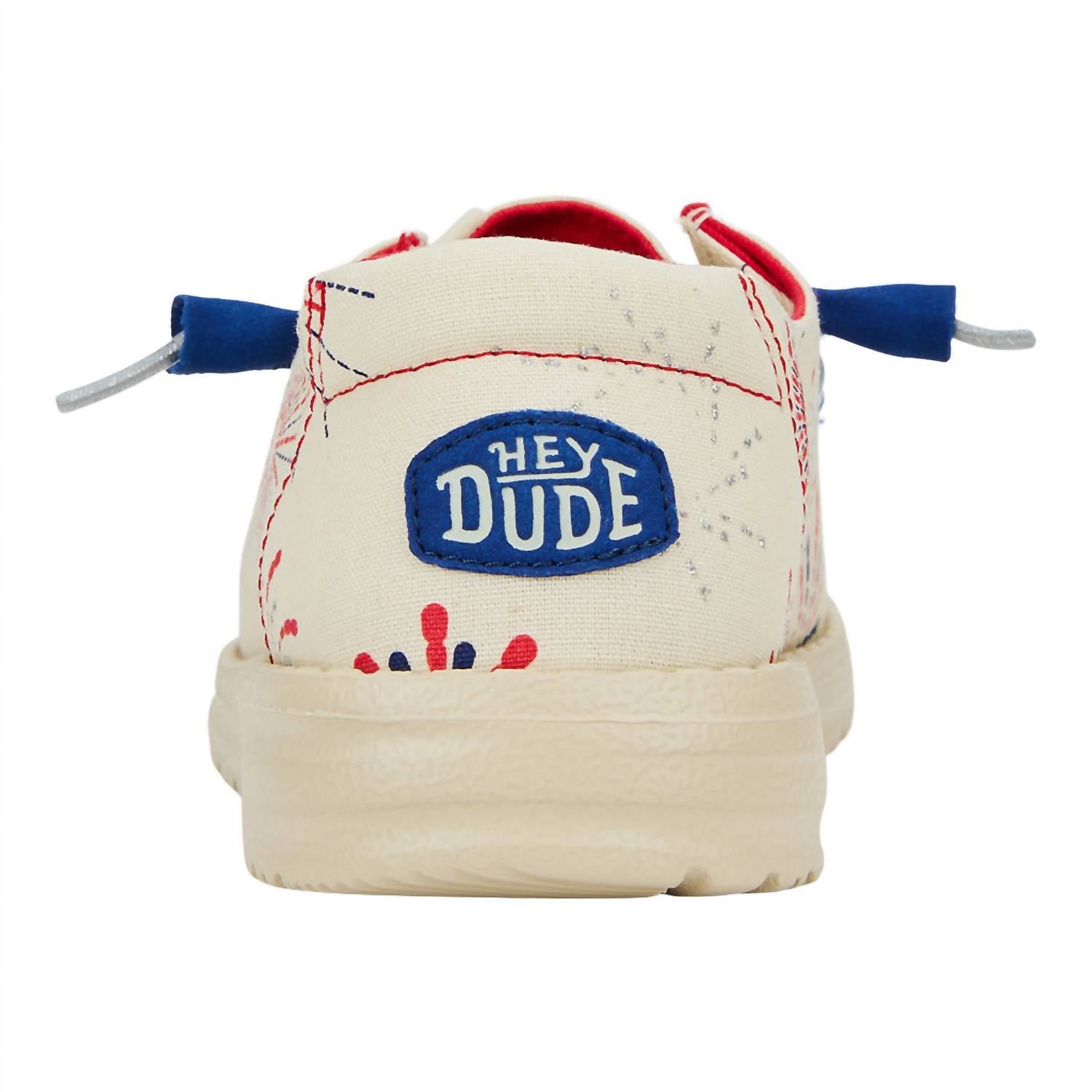 Loafers so versatile you can wear them with just about anything. Elevate your summer style with the Women's Wendy Fireworks Shoes by HEY DUDE, designed for a relaxed vacation feel. This canvas pair features a round toe and flat heel, making them ideal for streetwear and casual occasions. The shoes boast a flat heel height of 1" or under, ensuring all-day comfort. Perfect for those who appreciate effortless style combined with versatility.