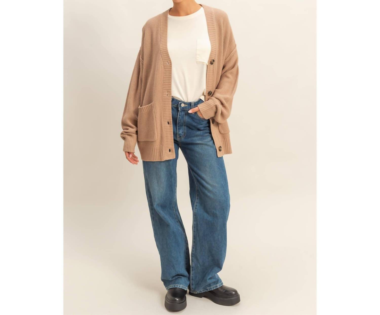 Throw this adorable cardigan over any cami or tank top. Elevate your wardrobe with the Button-Front Oversized Cardigan by HYFVE, crafted from 100% Acrylic for ultimate comfort and style. Designed in a chic dark taupe hue, this relaxed silhouette features long sleeves, a V-neck, and convenient front patch pockets. The cardigan is imported and fastened with a classic button closure. For easy care, simply machine wash. Model is 5'7", with measurements of 32" chest, 23" waist, and 34" hips, wearing a size small.