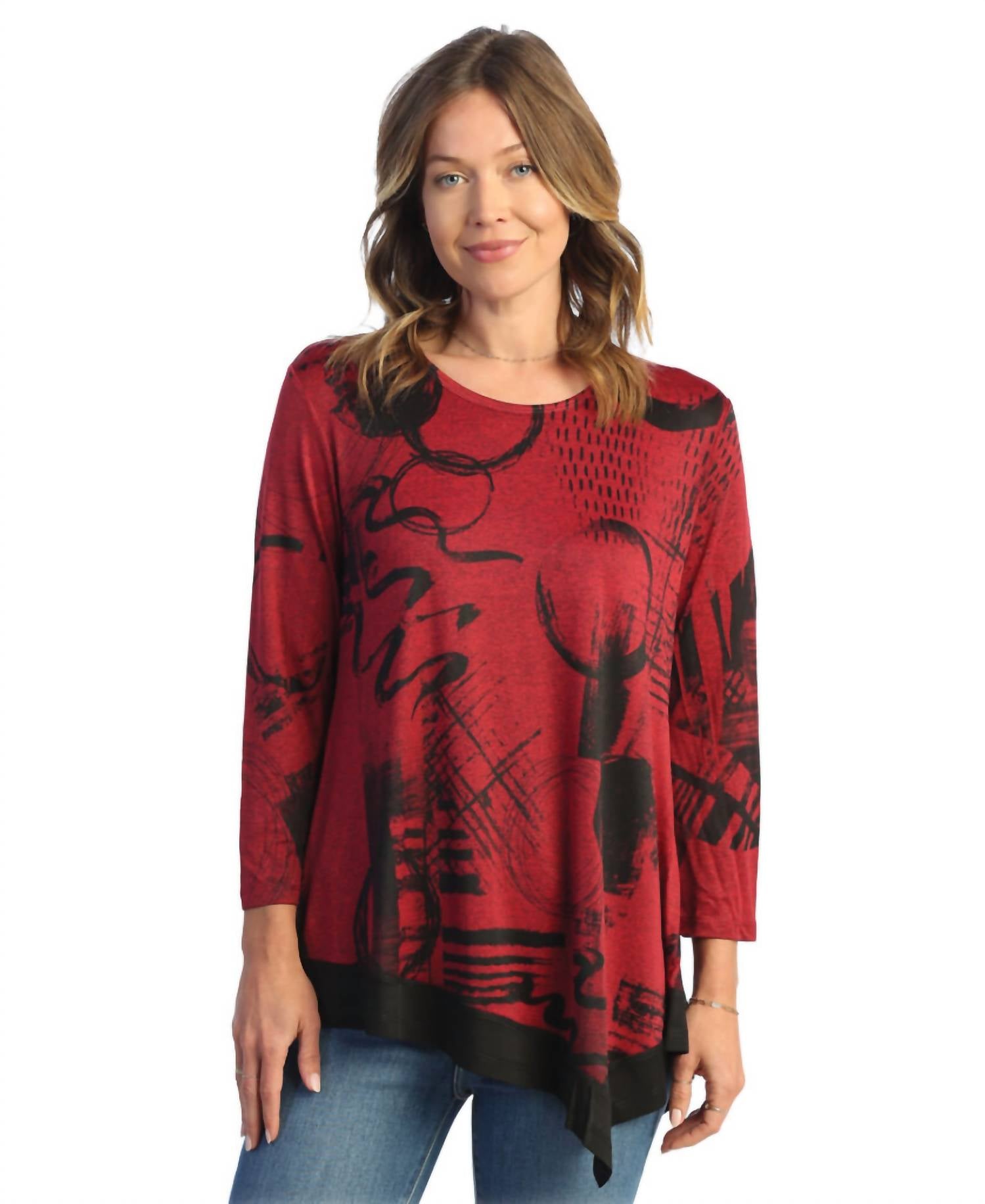 A versatile blouse that works from desk to dinner! Elevate your style with the Jazzy Asymmetrical Slinky Top by Jess & Jane in vibrant red, perfect for a chic streetwear look. This plus-size blouse boasts three-quarter sleeves, a unique black banded asymmetrical hemline, and is crafted from a silky stretch fabric composed of 95% Polyester and 5% Spandex. Made in the USA, it offers effortless pull-on closure and machine washability for easy care. Ideal for spring vacations or Easter gatherings, its A-line relaxed silhouette and graphic pattern add a touch of elegance to any ensemble.