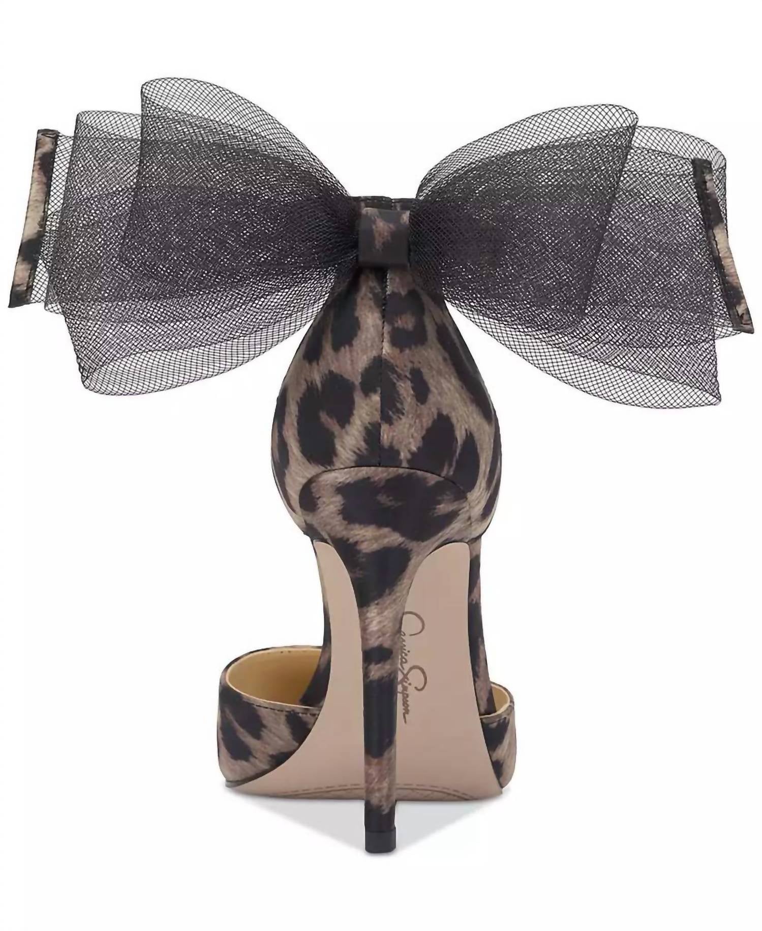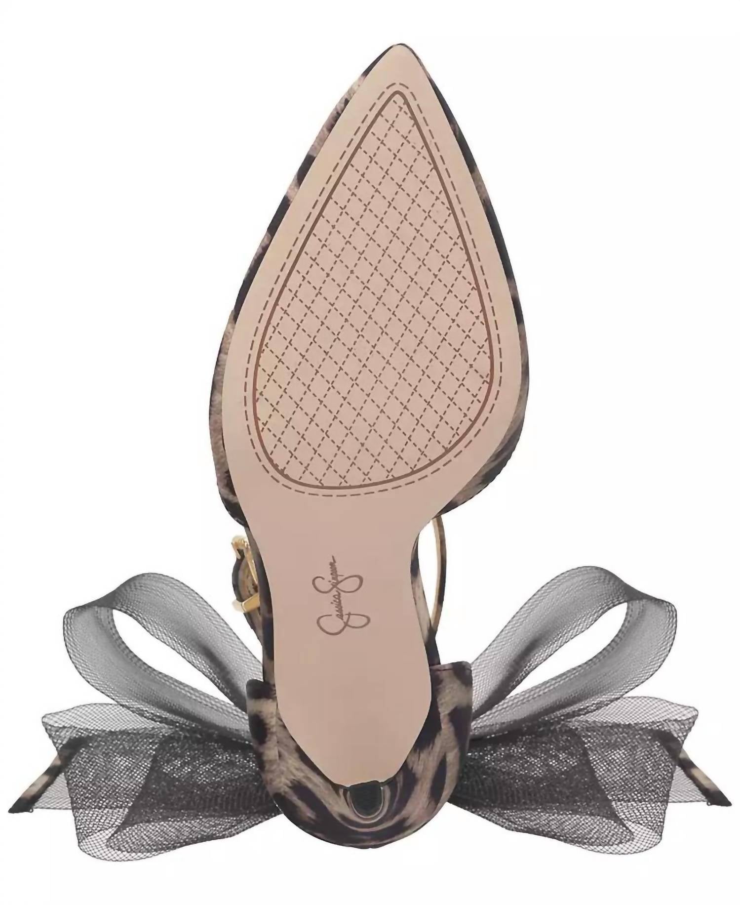 Pair these beauties with your favorite skinny jeans or dress for a night out on the town. Elevate your style with the Women's Phindies Bow Ankle-strap Pumps by Jessica Simpson in Safari Combo. These imported satin heels feature a sleek stiletto design and a chic ankle strap with a gold-tone buckle, adding elegance to any outfit. With a heel height of 3.54 inches, the shoe's pointed toe and statement mesh bow at the back bring a touch of drama to every step. Perfect for making a bold entrance, they're the height of sophisticated fun.