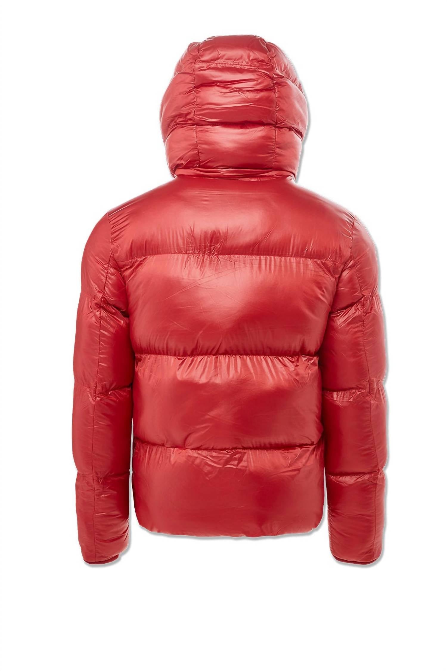 Introducing the Astoria Hooded Bubble Jacket by JORDAN CRAIG, a stylish and functional choice for men's fall streetwear in bold red. This long-sleeve puffer jacket boasts a 100% nylon shell with a synthetic down fill, offering water resistance and warmth. It features JORDAN CRAIG branded zippers, zipper closures at the pockets, and a removable, adjustable hood for versatility. With a zip closure, hand wash instructions, and a flat drying process, it's perfect for travel and Thanksgiving occasions.