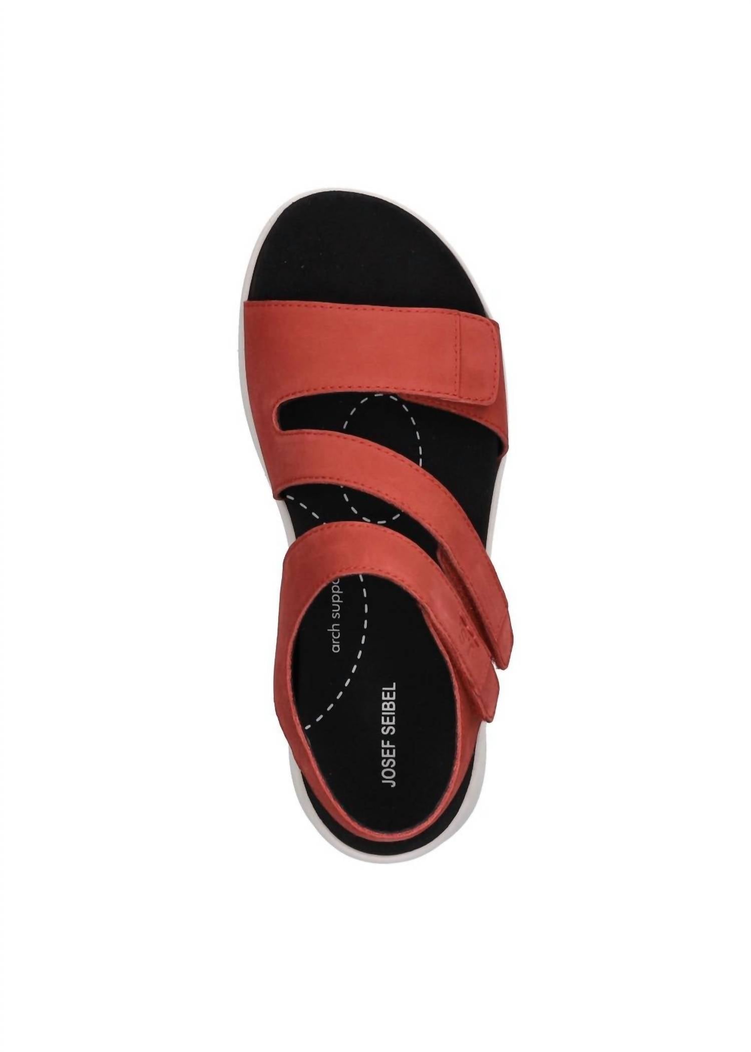 This sandal will take you from brunch to dinner and everything in between. Discover the JOSEF SEIBEL Women's Estelle Sandal, an essential footwear choice for your adventures. These red sandals feature a full-grain leather upper, offering a sleek minimalist look. Its adjustable hook and loop straps, along with a removable padded and contoured insole, deliver a perfect and personalized fit. Complete with arch and metatarsal support, and a microfiber lining on a padded foam footbed, these flat-heeled sandals ensure comfort with every step. Ideal for vacations, they're perfect for the spring season and occasions like Easter.