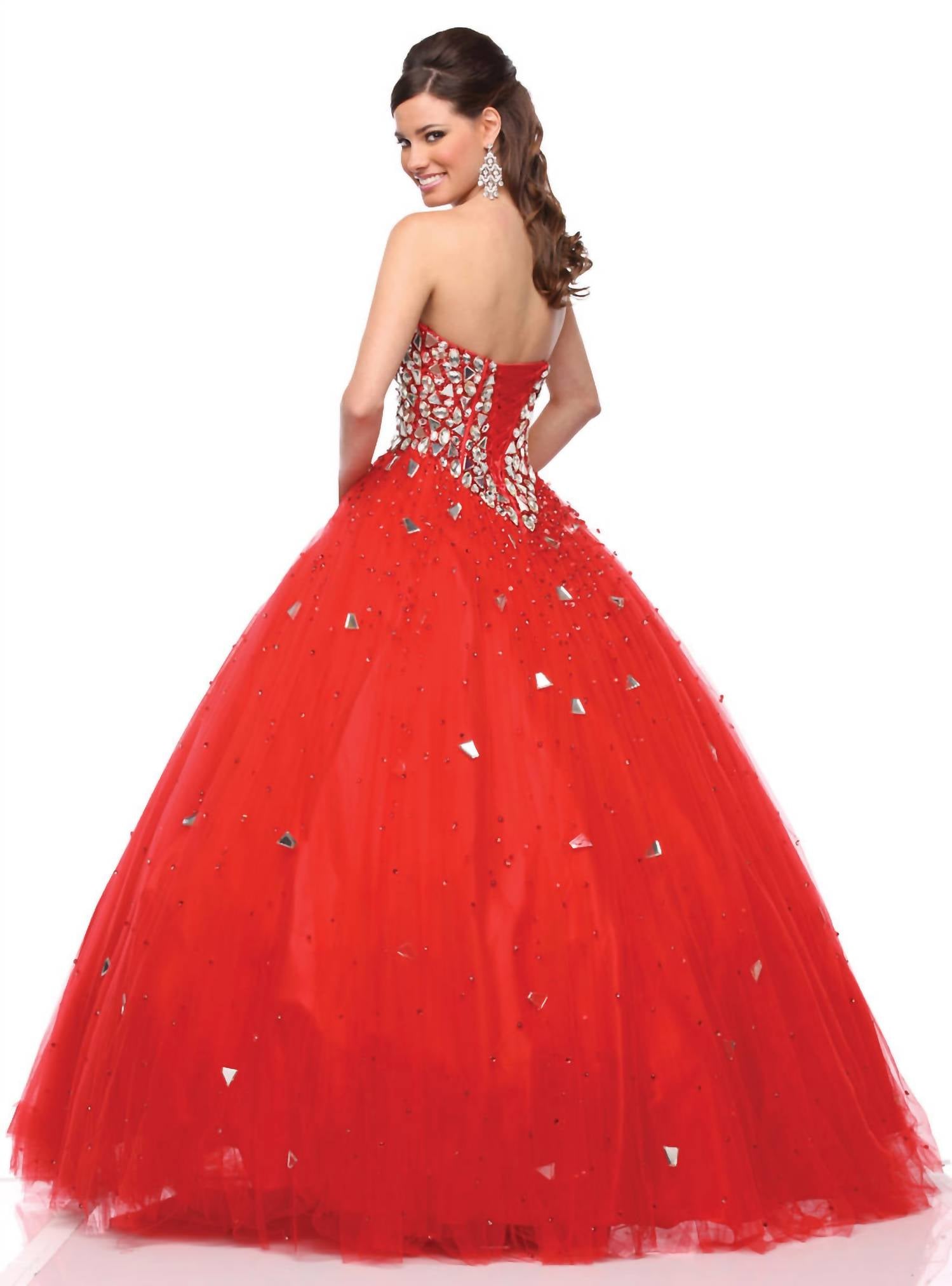 Just add a cute little clutch and a matching heel for the perfect event look. Turn heads at prom with the stunning Beaded Mirror-work Bodice Ball Gown by Karishma Creations in eye-catching red. This exquisite gown boasts a strapless design with a sweetheart neckline and a fully beaded bodice adorned with intricate mirror work, beautifully complemented by a beaded A-line tulle skirt. Closure: Zip closure. Perfect for making a memorable entrance.
