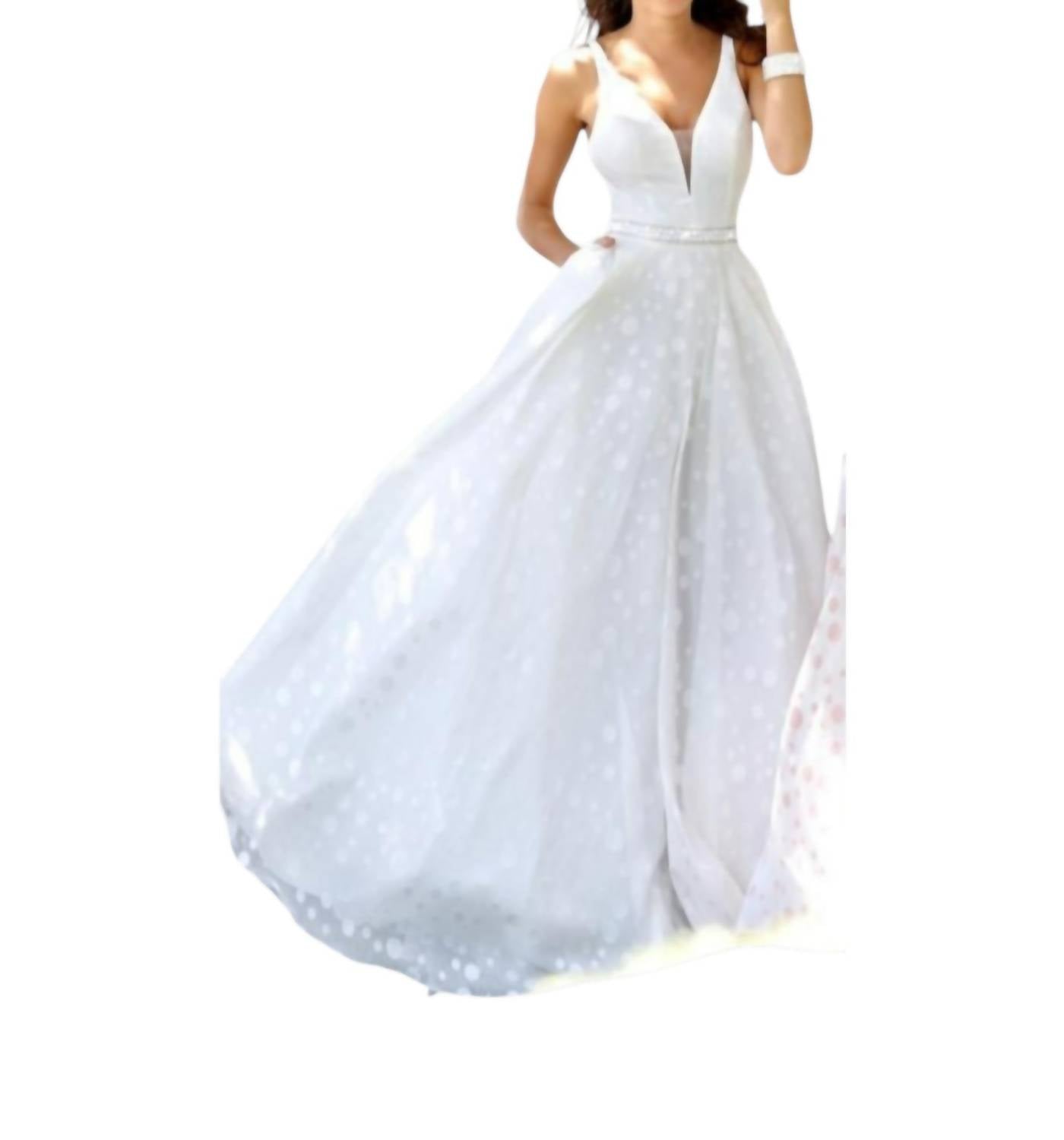 Looking for that perfect event dress? Look no further... Step into elegance with the Karishma Creations Elegant Printed Sleeveless Gown in a stunning ivory hue. This A-line silhouette features a V-neckline and a sophisticated patterned design, perfect for prom or any special occasion. With the added convenience of pockets and a secure zip closure, this gown combines style and functionality. Customize your care routine to keep this exquisite piece looking its best.
