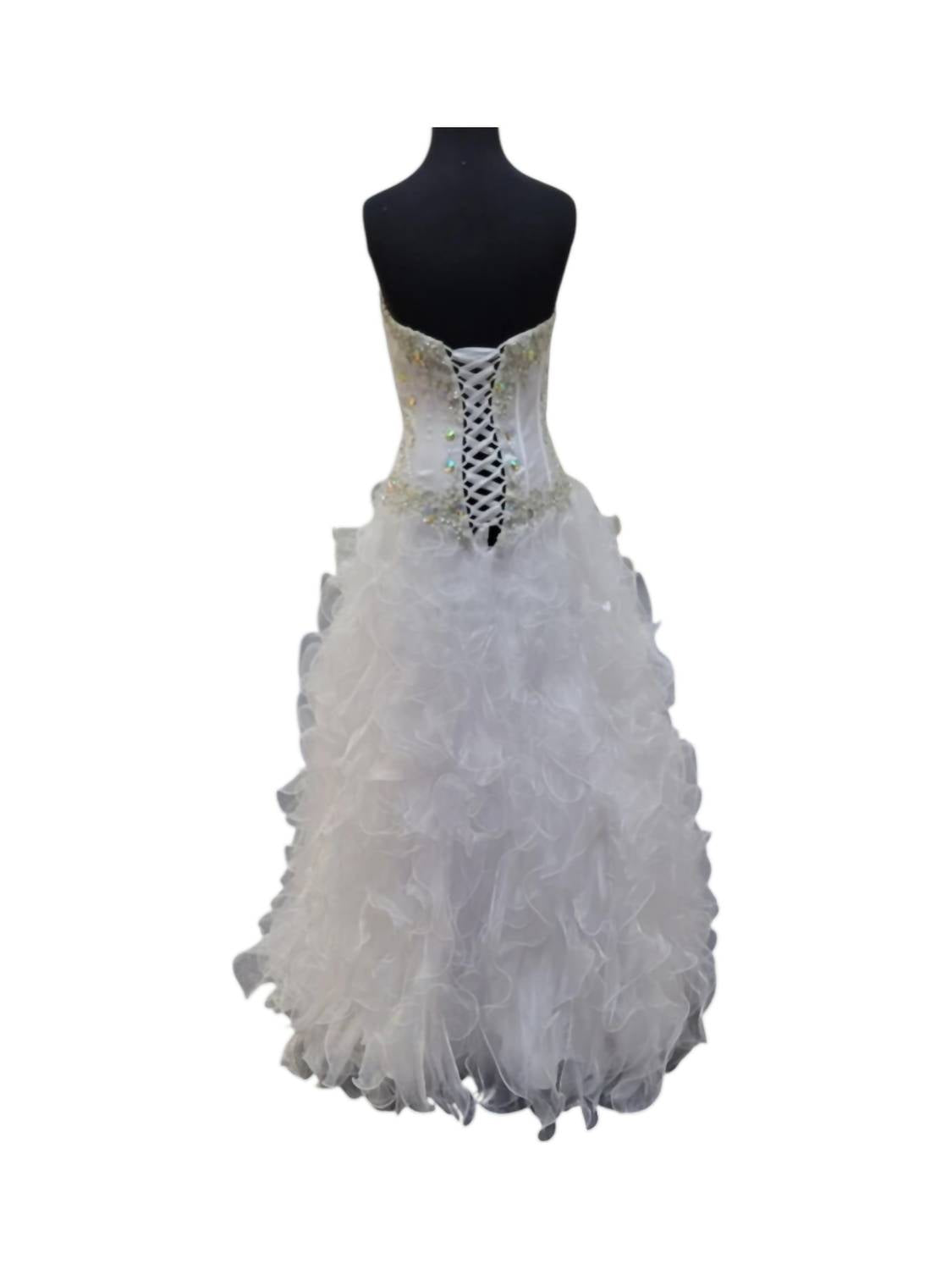 Turn heads in the cutest and most flattering evening dress. Introducing the Regal Embellished Ball Gown by Karishma Creations, an elegant choice for any formal occasion. This white, sleeveless gown is crafted from luxurious organza, featuring a sweetheart neckline that complements the exquisite embellishments on the corset bodice. Designed with a Basque waist and a voluminous, floor-length skirt adorned with frill ruffles, it offers a stunning silhouette for your next event. Closure: Lace-up tie closure.
