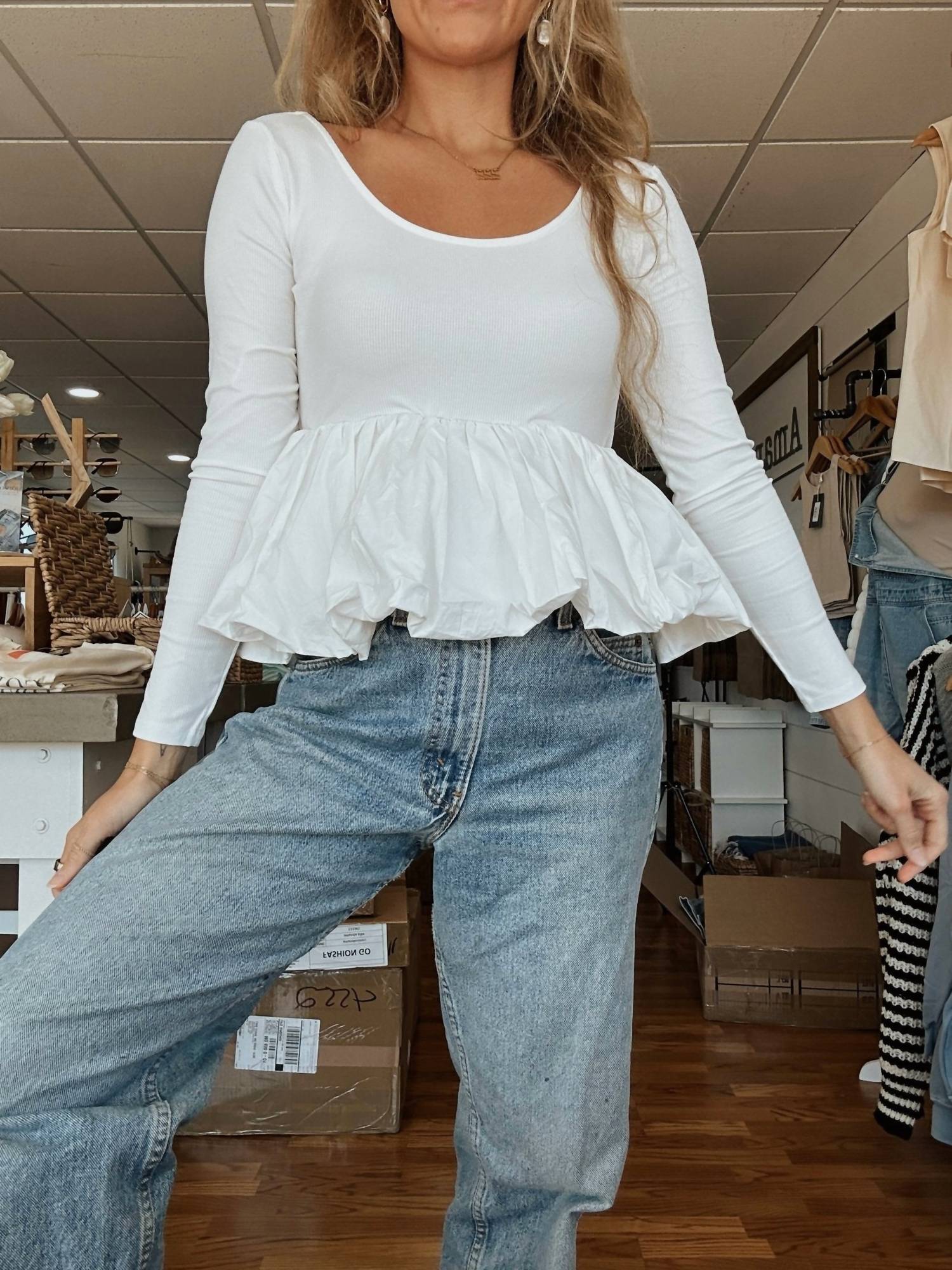 A versatile blouse that works from desk to dinner! Elevate your style with the MABLE Bubble Hem Scoop Neck Top, the perfect blend of chic and comfort. This women's blouse features a flattering scoop neck and playful bubble hem, paired with long sleeves for an elegant touch. Crafted in a solid white hue, it's a versatile choice for a spring holiday party. Closure is a convenient pull on design, adding to its effortless appeal.