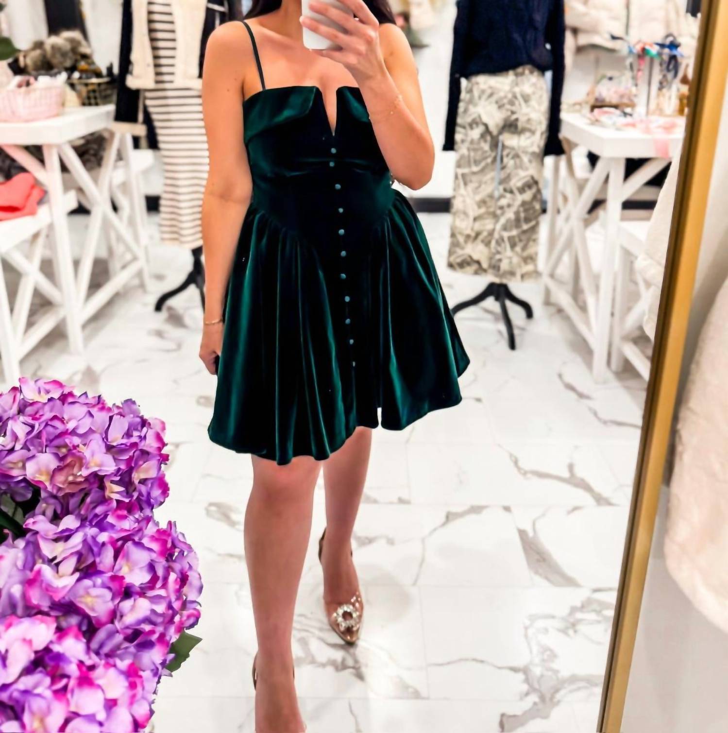 The perfect mini skirt does exist. Introducing the Women's Terra Tone Velvet Mini Dress by MABLE, the perfect choice for an evening event. This statement dress in luxurious hunter green features dainty spaghetti straps and a structured bust with a subtle notched neckline. Crafted from 100% polyester velvety material, it showcases a mini length with an A-line fit, a drop waist, and a back tie enhancing its romantic aura. Closure: Zip closure. Model wears size small (Height: 4'10", Dress Size: 4, Waist: 27, Bra Size: 32D).
