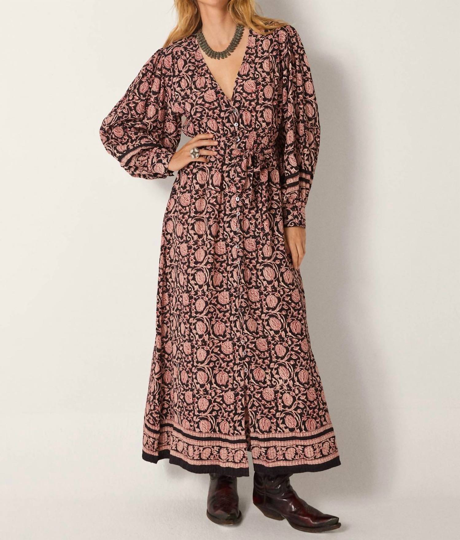 The pefect long sleeve dress for those cooler months. The Ebony Rose Samy Maxi Dress from Maison Hotel is a stunning long-sleeve piece perfect for a bohemian, vintage-inspired look. Crafted from 100% viscose, this dress features a flowing A-line silhouette with a deep V-neckline and a partial button front closure. The self-tie belt enhances the waist, while gathered cuffs and border prints along the cuffs and hem add artisanal charm. Care is simple with a hand wash recommended, allowing the rose-toned floral motifs to maintain their timeless allure.