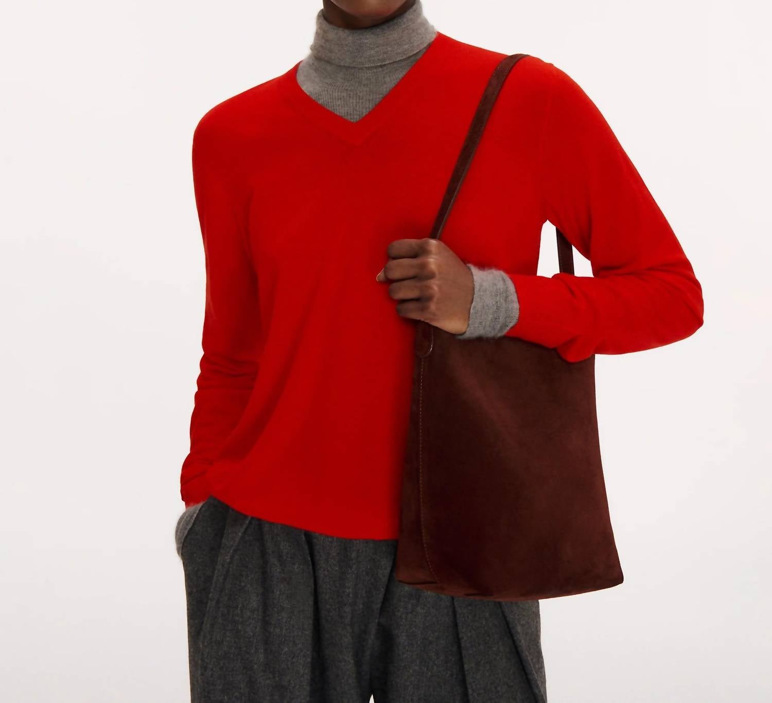 Meet the Women's Small Everyday Cabas by Mansur Gavriel, a sophisticated shoulder bag in chocolate-hued Italian suede leather. This perfectly slouchy bag features sleek elongated handles and a convenient magnetic closure, making it ideal for organizing your daily essentials like a tablet and notebook. Compact with dimensions of Width: 21cm (8.2in), Height: 25cm (9.8in), Depth: 13cm (5in), and a Strap Drop of 30.5cm (12in), it's lightweight at 14.2 oz. With a water-resistant interior lining and crafted with care in Italy, this bag combines elegance with everyday functionality.