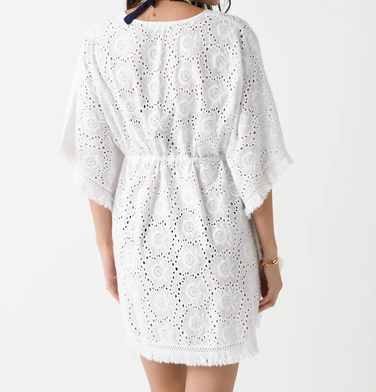 A comfy-all-day coverup that works just as good at dinner as it does by the pool. Embrace the Boho Chic trend with the Ivy Short Sleeve Kaftan by Melissa Odabash, perfect for a summer beach day. Made from 100% cotton, this white textured kaftan features billowing sleeves and falls to a mid-thigh length with a stylish V-neckline. It elegantly showcases delicate broderie anglaise detailing and fringe trims and is finished with a drawstring waist featuring signature gold-tone cord ends. Care instructions suggest hand washing to maintain its pristine condition. This item is One Size, offering full coverage as a stylish swim coverup.