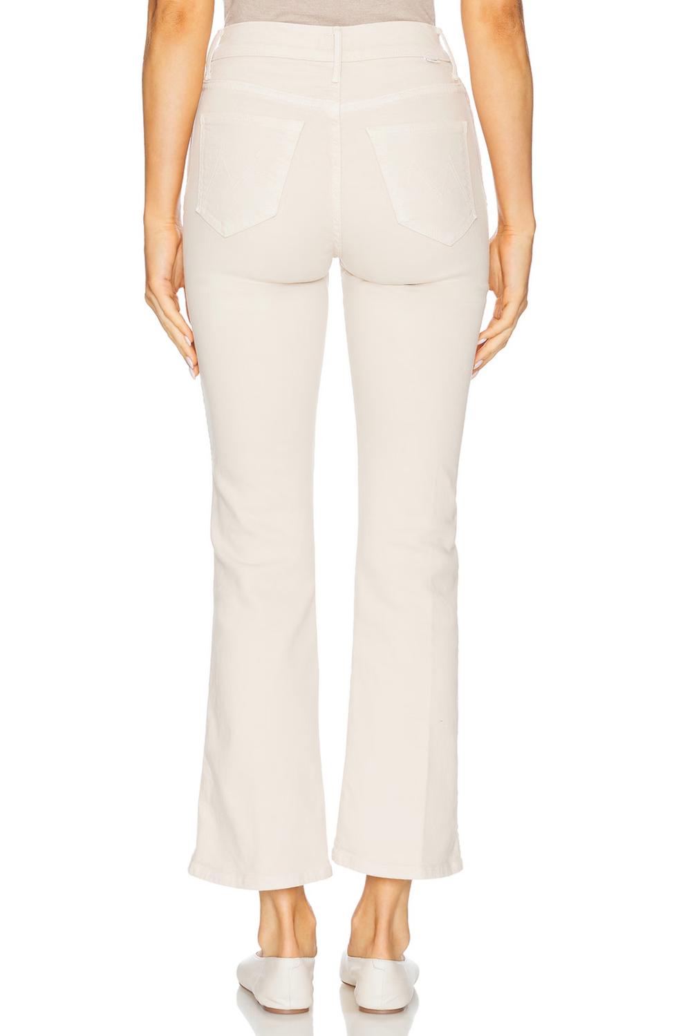 Slightly flared pants are all the rage right now and these are no exception. Pair these with your favorite tee for a more casual look, or with your favorite button-up blouse for an evening out. Introducing the Mid Rise Smokin' Double Flood Pants by Mother, a perfect blend of style and comfort in a sophisticated off-white hue known as Tapioca. These solid-patterned pants feature a regular fit with a flared leg and a mid-rise waist, accentuating a chic streetwear look. Crafted from a cotton blend of 94% Cotton, 4% Polyester, and 2% Elastane, they offer a 28.25-inch inseam with a clean hem. Designed with convenient pockets, a zip closure, and easy maintenance through machine wash and tumble dry, these pants are ideal for summer outings or a holiday party.