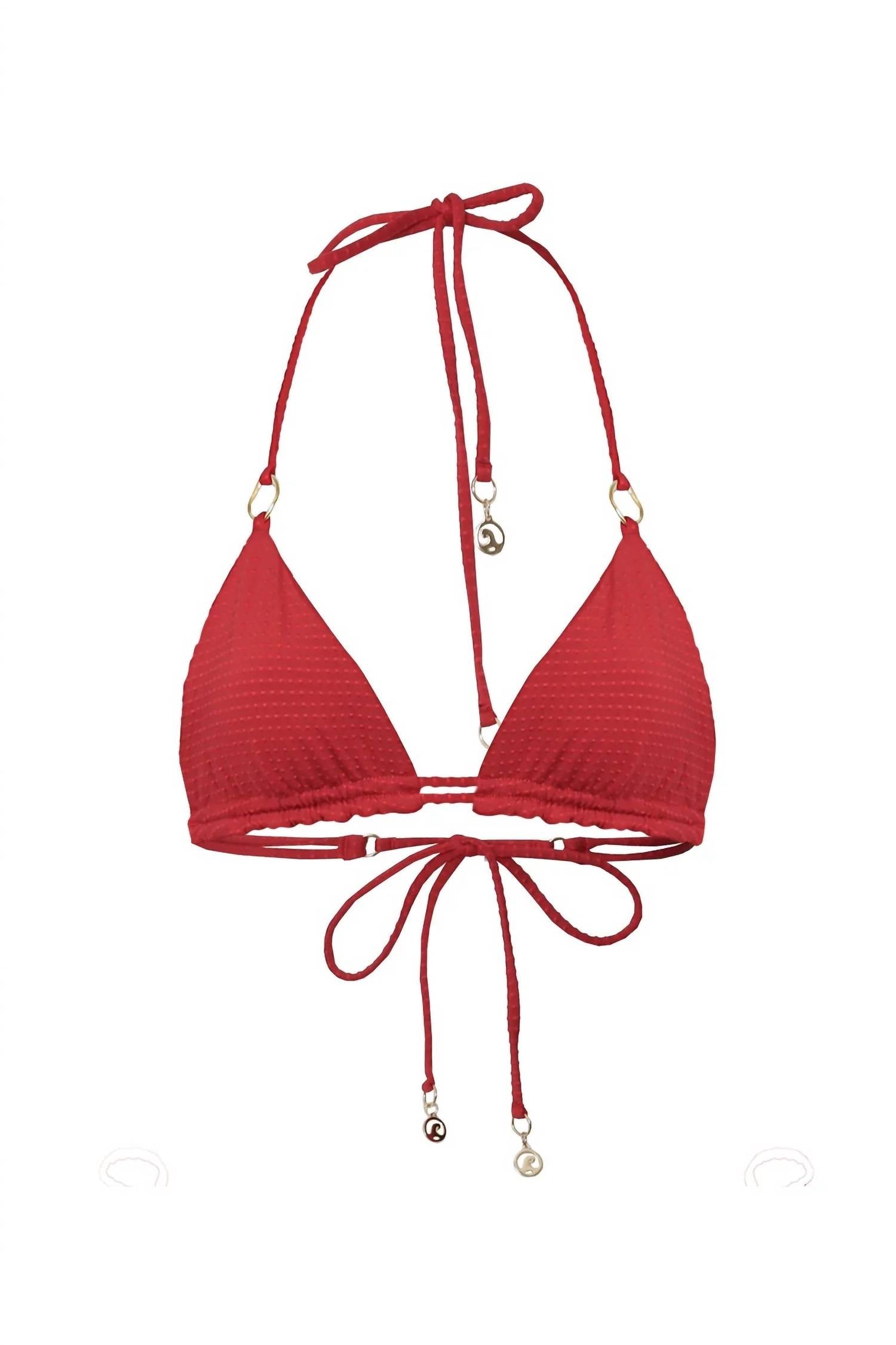 Ideal for relaxed poolside moments, this adorable swimsuit effortlessly transitions into the perfect sunset dinner outfit when paired with a flowing skirt. Enhance your beach look with the Ola Azul April Flare Triangle Bikini Top in vibrant red, designed for the perfect summer vibe. This swim top features a textured fabric with removable soft cups and hardware details for adjustable coverage, complete with a double underbust band for added support. Closure: Back and neck tie closure. Made in Colombia with care instructions to hand wash and hang dry.