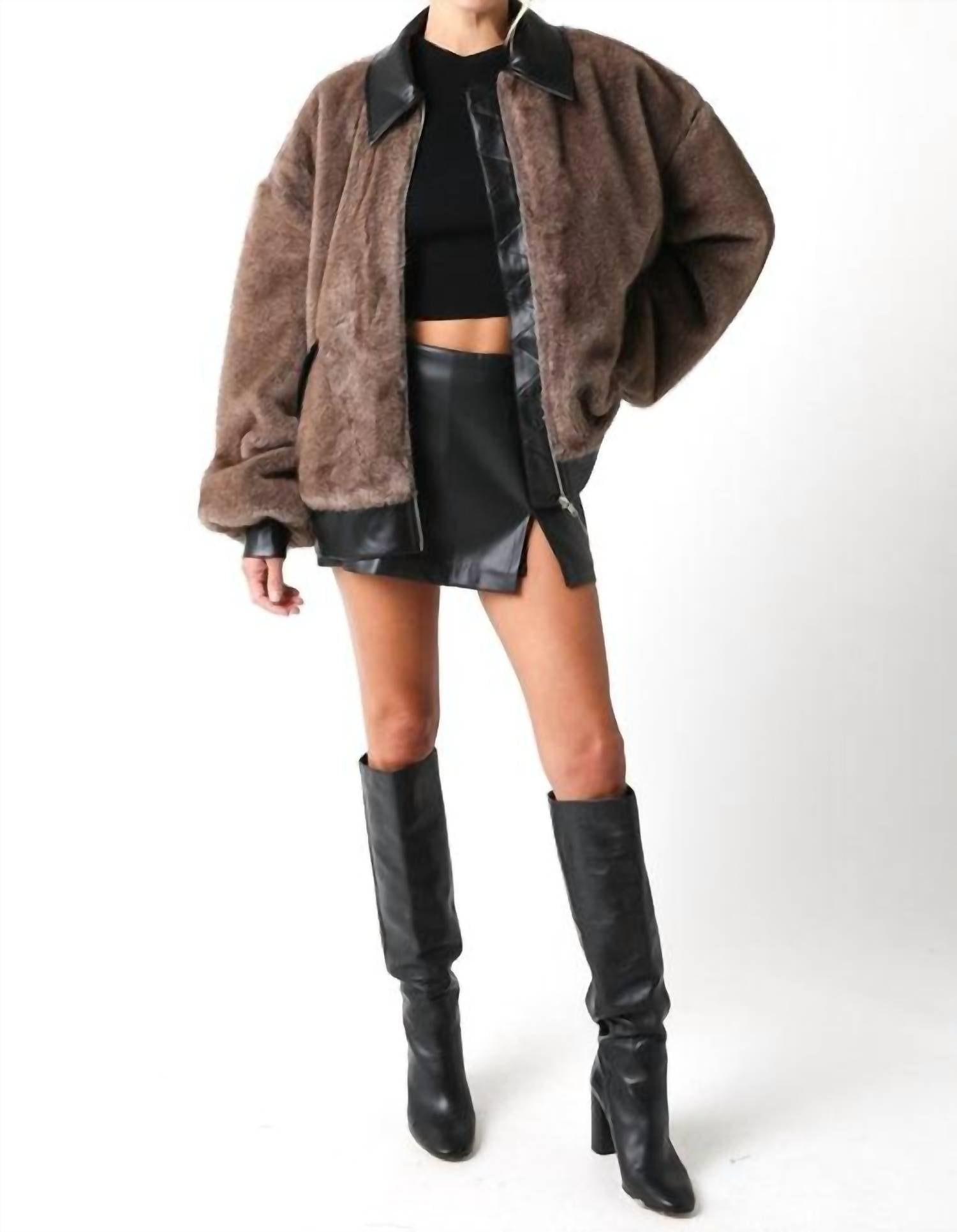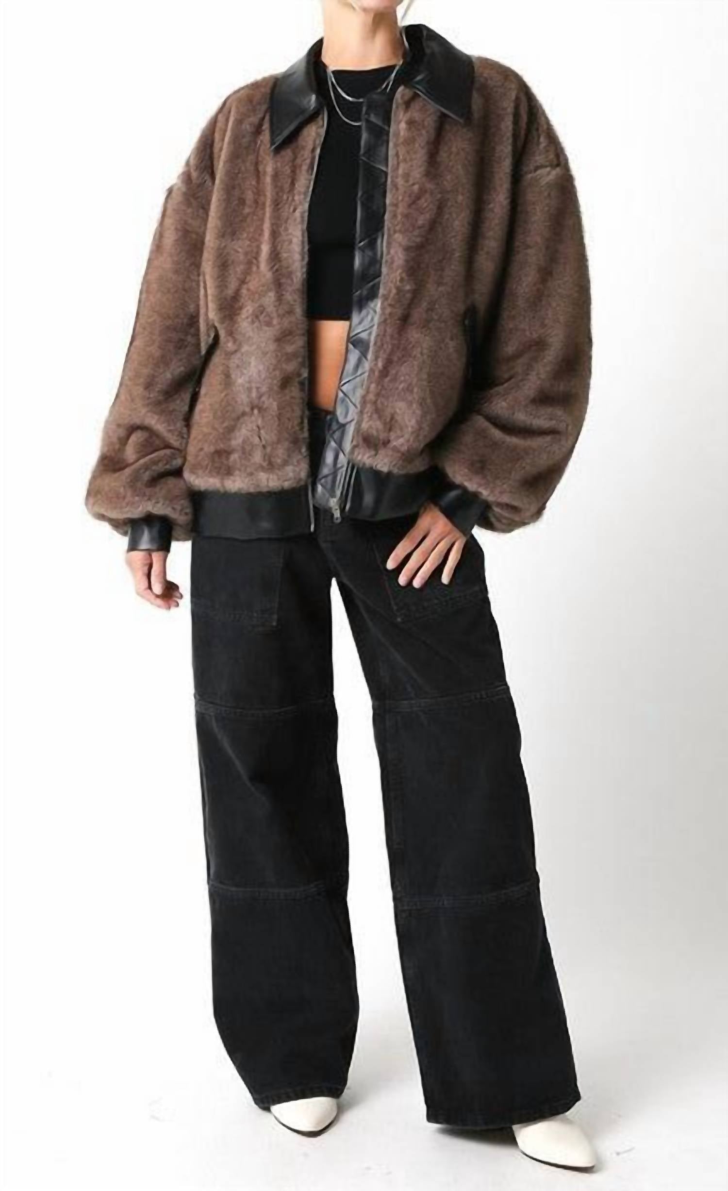 Everyone needs a leather jacket like this in their closet. Presenting the Carrie Faux Fur & Leather Jacket by OLIVACEOUS, a chic addition to your winter wardrobe with long sleeves and a relaxed oversized cut. Crafted from luxurious faux fur with refined faux leather trim, this jacket offers both style and comfort. It features a practical zip closure and functional front pockets, making it a versatile piece for layering. This solid-patterned jacket is of imported origin and designed for effortless elegance.