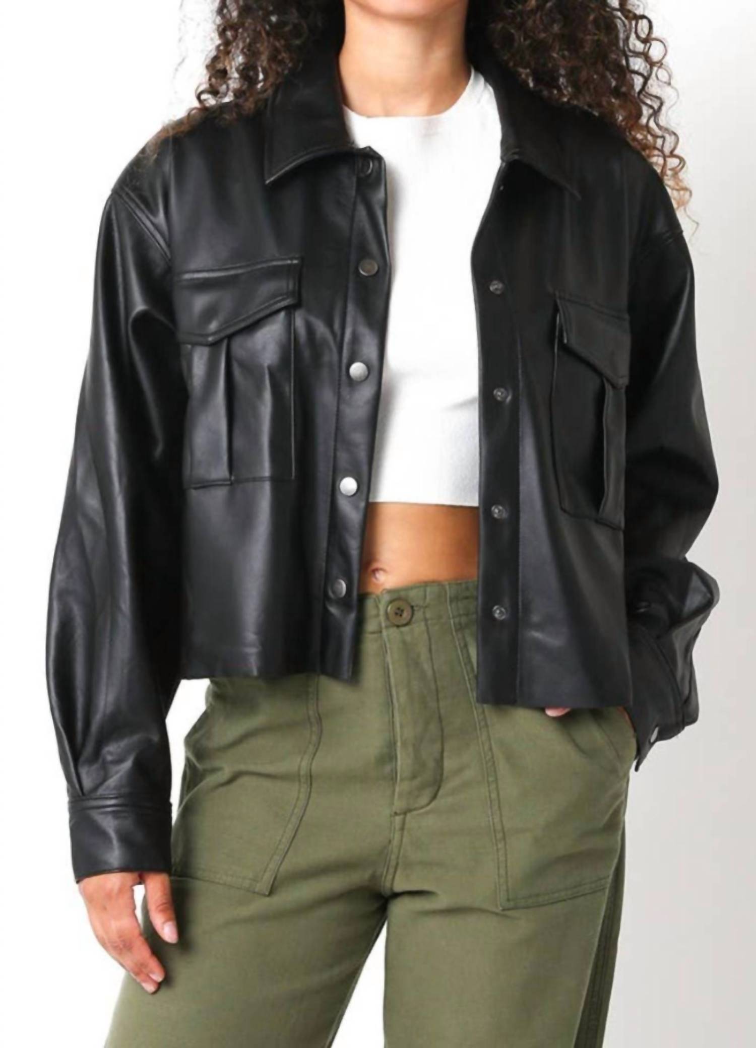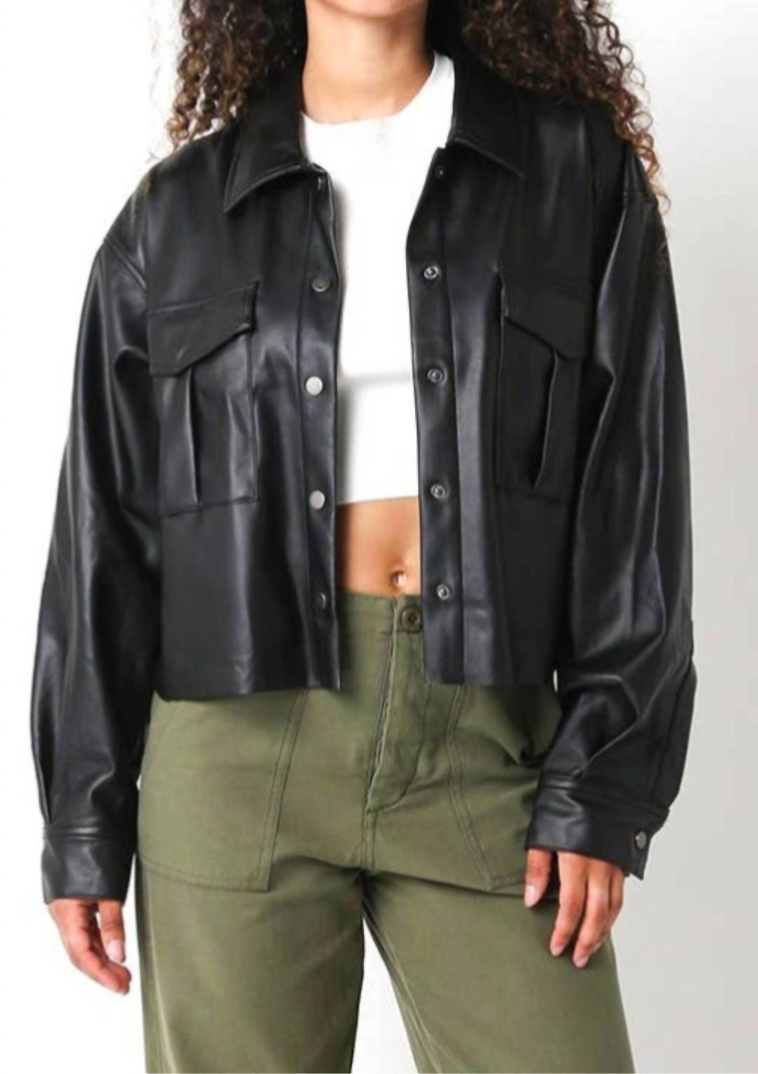 A leather jacket so good, it works with just about any outfit. Discover the OLIVACEOUS Faux Leather Buttoned Jacket, a quintessential piece perfect for fall streetwear style. Crafted from high-quality leather, this solid black jacket features a classic collar and long sleeves for a sleek, edgy look. Designed with convenient pockets and a snap closure for added functionality. Ideal for elevating your dinner party ensemble with effortless sophistication.