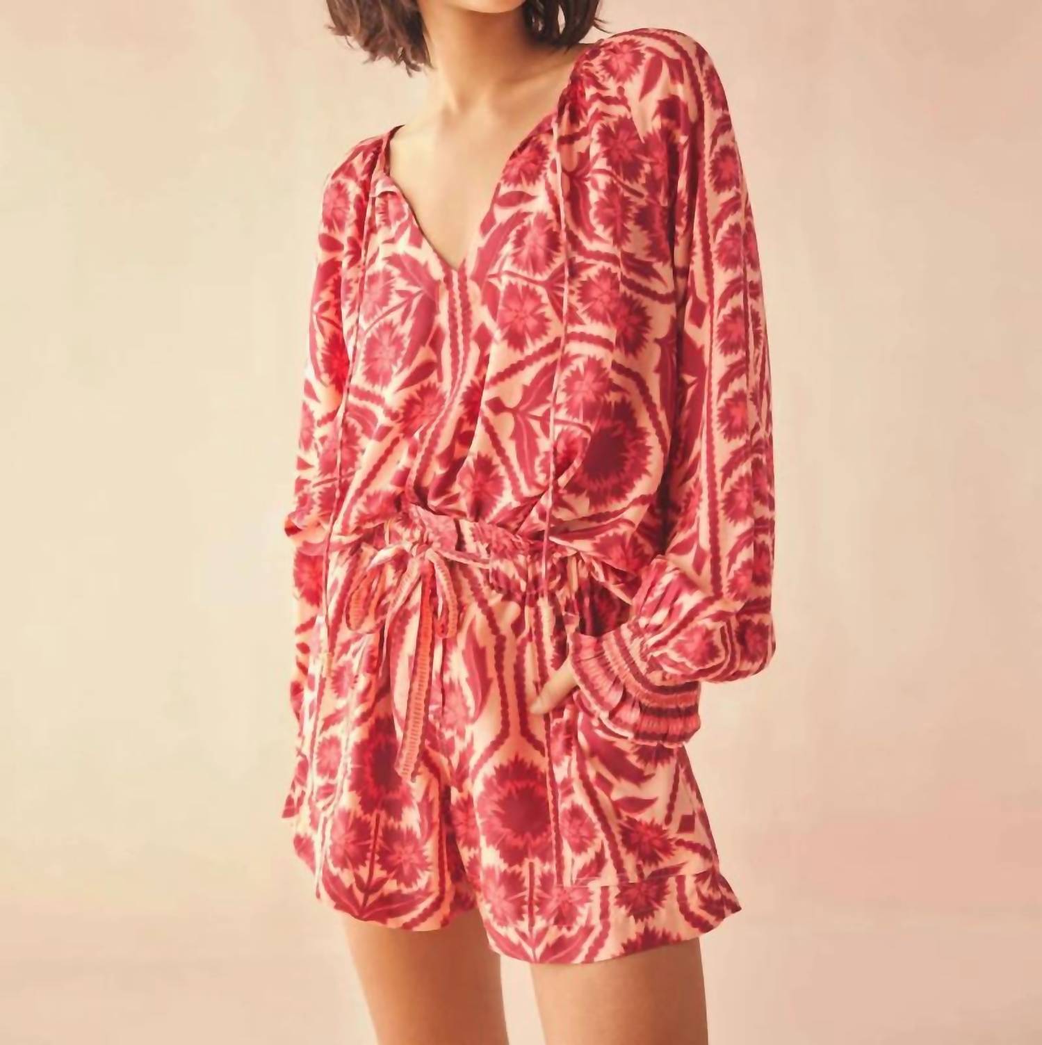 A versatile blouse that works from desk to dinner! Introducing the Riviera Blouse by OMIKA in the captivating Tessa Goji pattern, perfect for any spring wardrobe. This patterned blouse features elegant long peasant sleeves and a versatile tie closure at the draped neckline, offering an effortlessly chic v-neck option. Crafted from 100% modal, the blouse is 24 3/4" in length with a 6" neck opening from size S and boasts a drop shoulder detail for a relaxed fit. Care for this piece by machine washing and line drying to maintain its pristine condition.