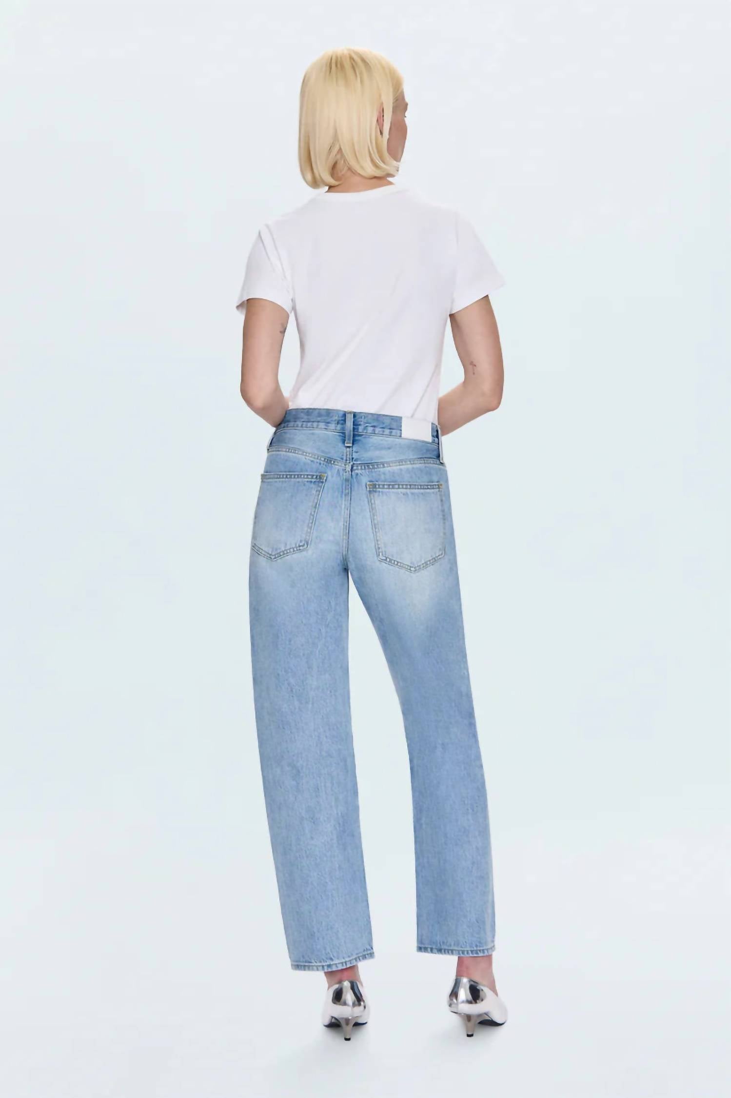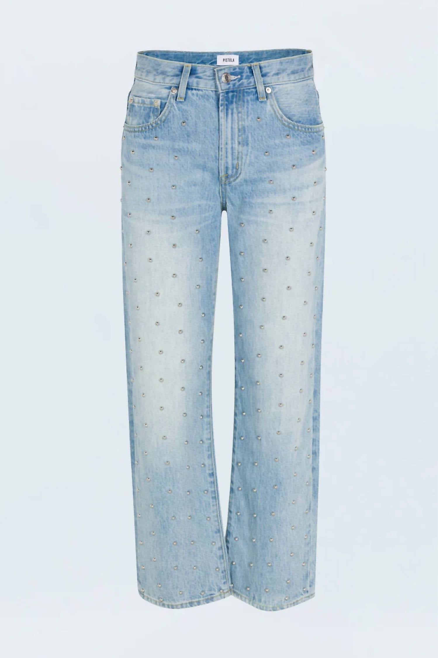 Pair these straight leg jeans with flats, sandals or even heels! You can't go wrong. Discover the Lexi Mid Rise Bowed Straight Jeans by PISTOLA, the epitome of sophisticated style combined with streetwear flair. These jeans, crafted from durable cotton in a striking light denim hue, feature a regular fit with straight legs and a mid-rise waist, accented by an artful textured pattern and subtle stud details. With a 29" inseam, they taper neatly to a cropped ankle, providing a refined silhouette that is both impactful and elegant. Closure: Button closure. Care: Machine wash and tumble dry.